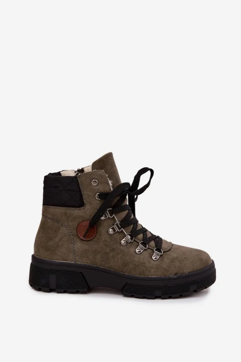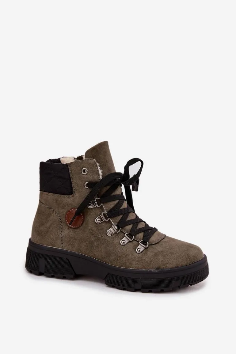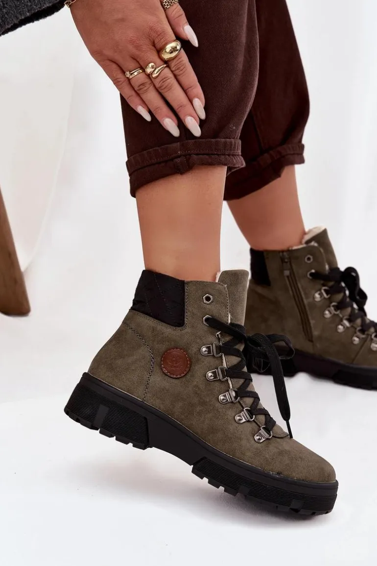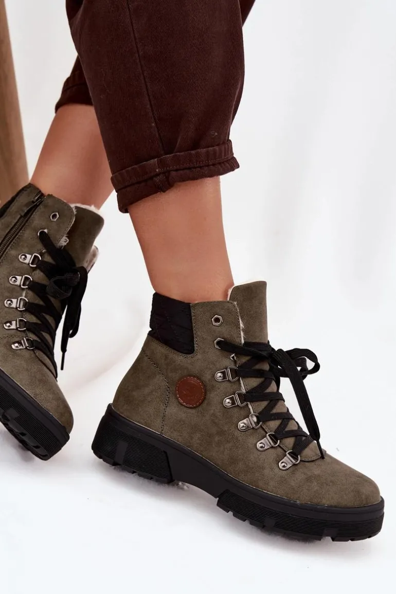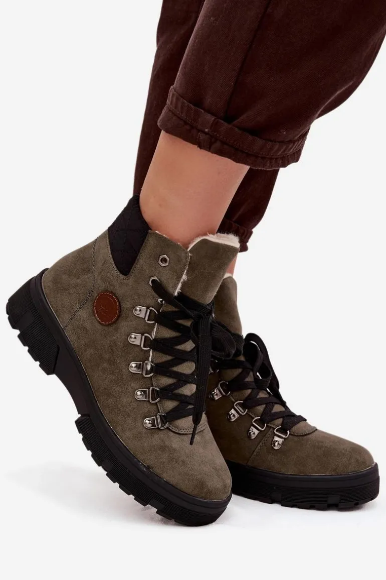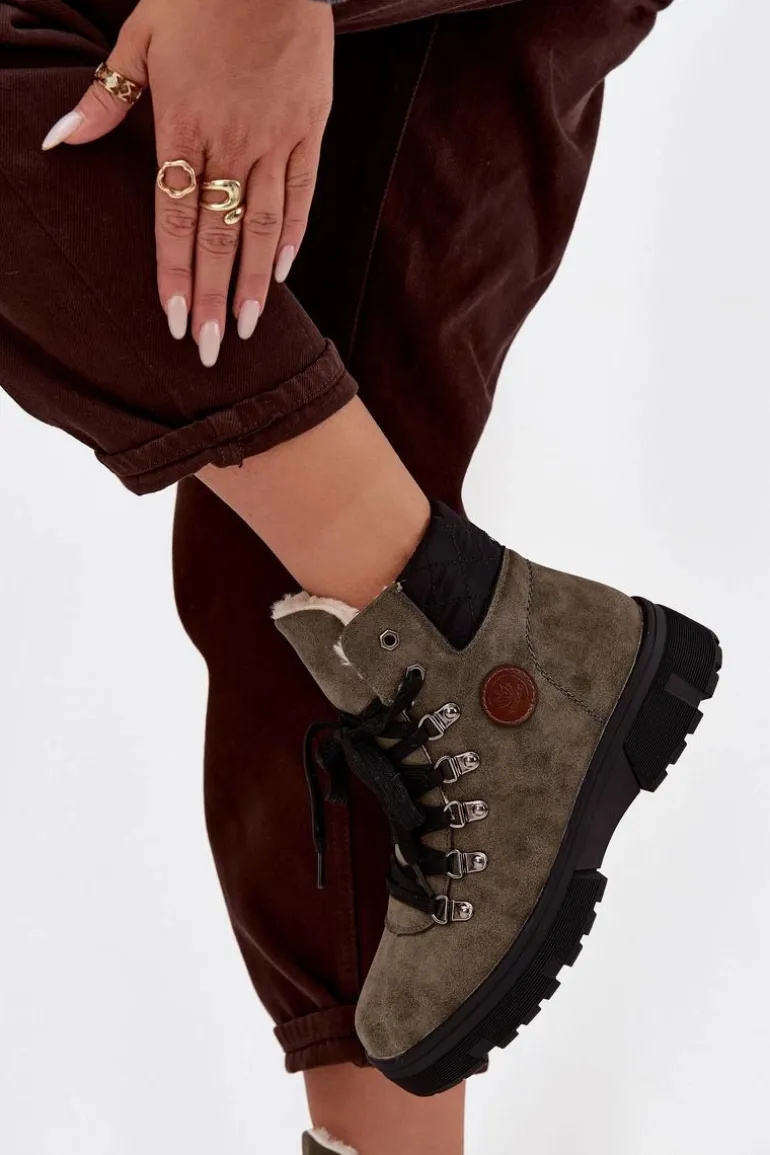 Damskie trapery wykonane z eko skóry to stylowa i praktyczna propozycja na chłodniejsze dni. Osadzone na solidnej platformie, zapewniają stabilność i wygodę podczas chodzenia. Wnętrze ocieplone miękkim futerkiem gwarantuje ciepło i komfort, dzięki czemu buty świetnie sprawdzą się w zimowe dni. Model posiada zarówno sznurowanie, jak i zamek, co ułatwia zakładanie oraz pozwala na idealne dopasowanie do stopy. To uniwersalne trapery, które doskonale uzupełnią codzienne stylizacje. Przy wyborze rozmiaru prosimy sugerować się tabelą rozmiarów.