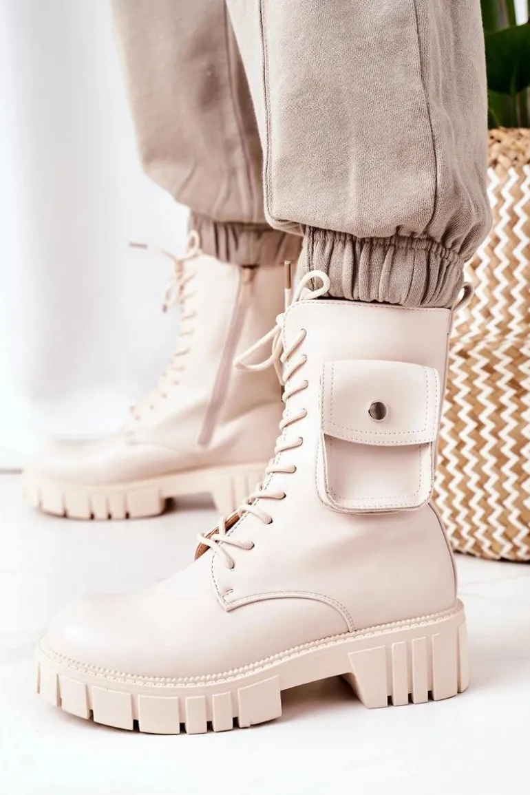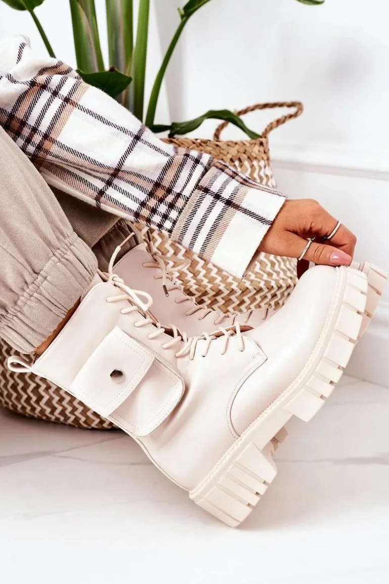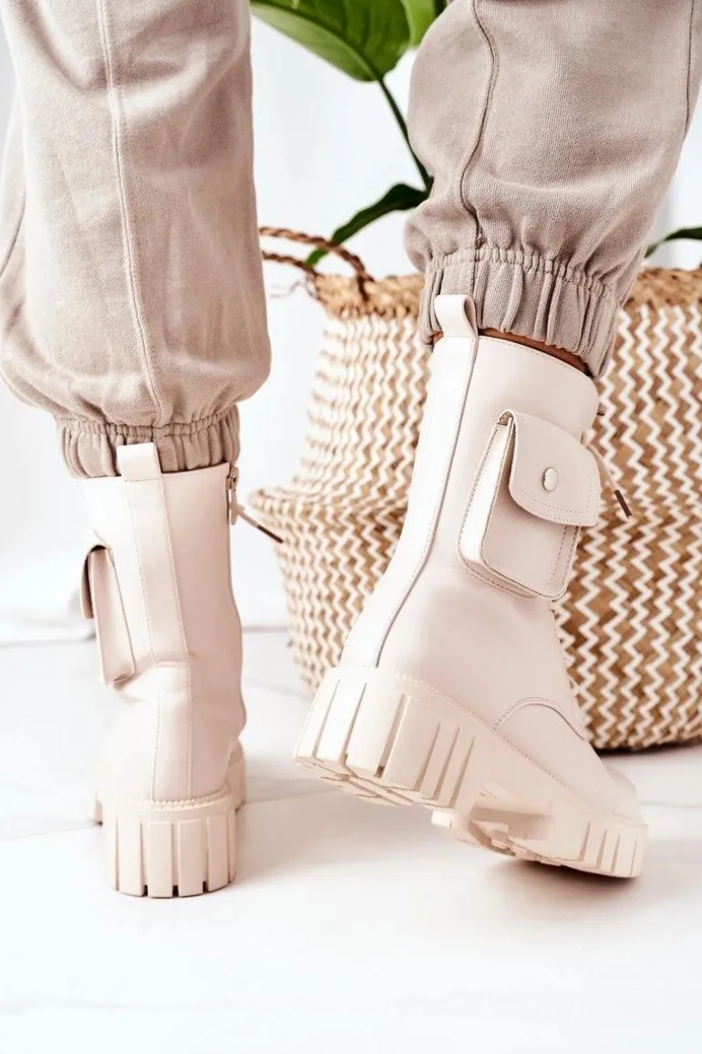 Botki damskie wykonane ze skóry ekologicznej ozdobione modną kieszonką. Wnętrze butów ocieplone jest miłym w dotyku kocem obuwniczym. Przy wyborze rozmiaru prosimy sugerować się tabelą rozmiarów.