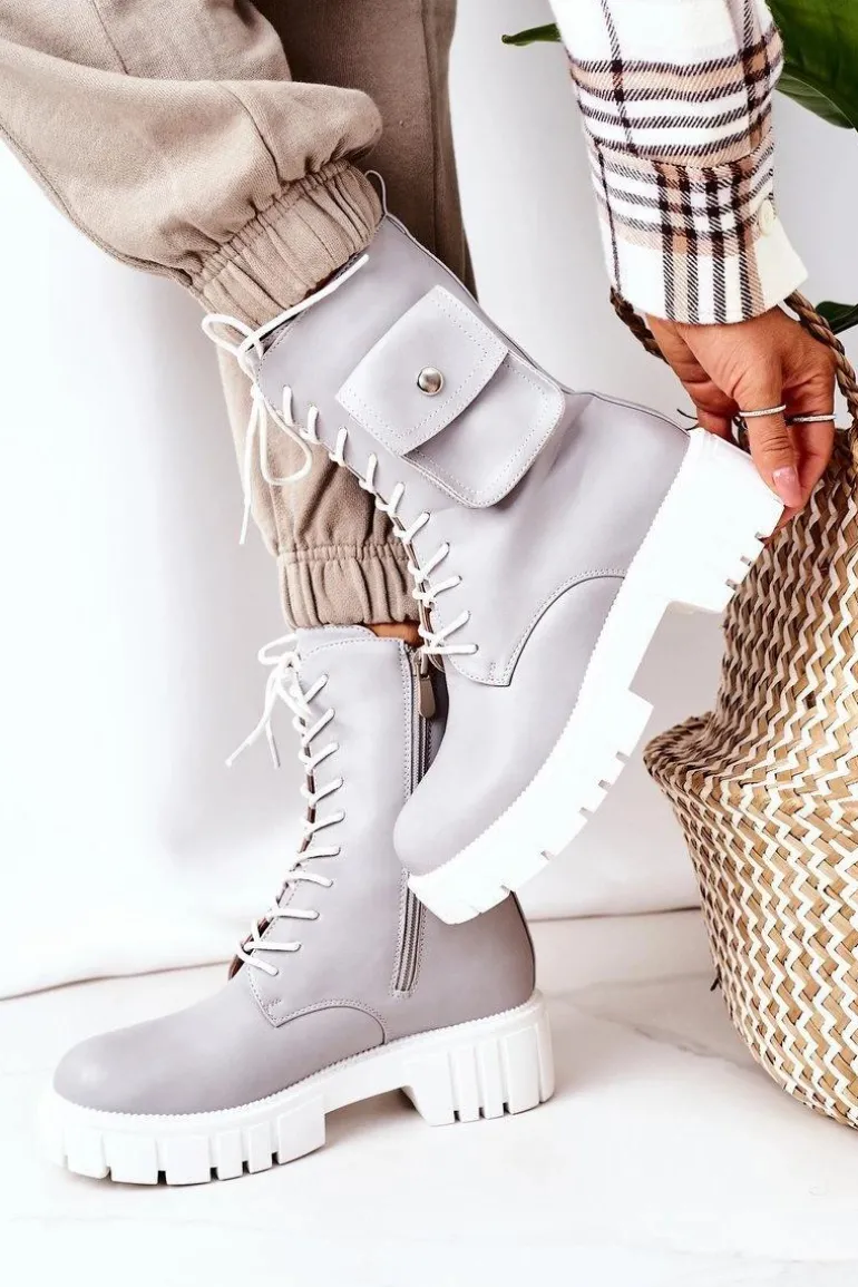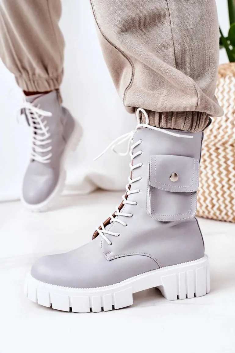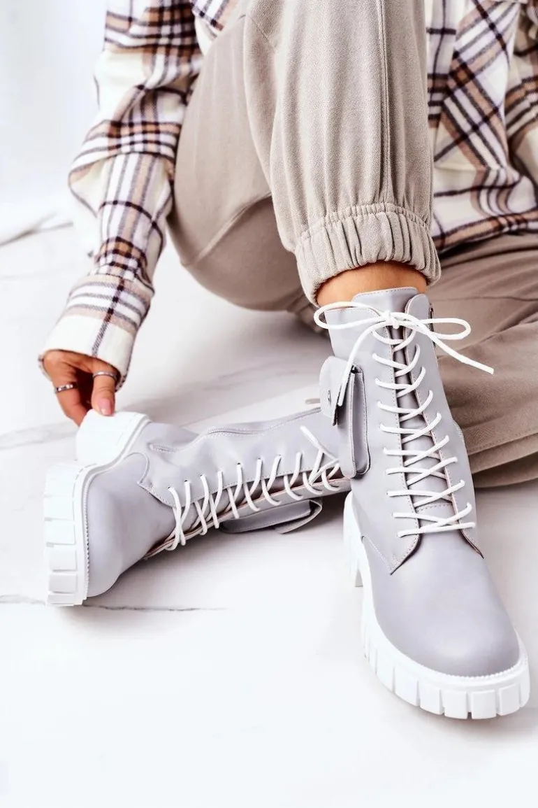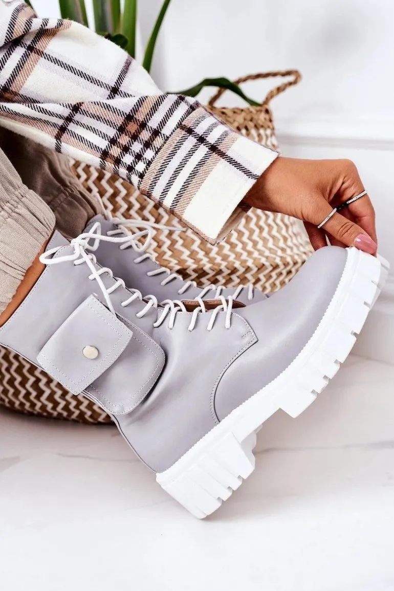 Botki damskie wykonane ze skóry ekologicznej ozdobione modną kieszonką. Wnętrze butów ocieplone jest miłym w dotyku kocem obuwniczym. Przy wyborze rozmiaru prosimy sugerować się tabelą rozmiarów.