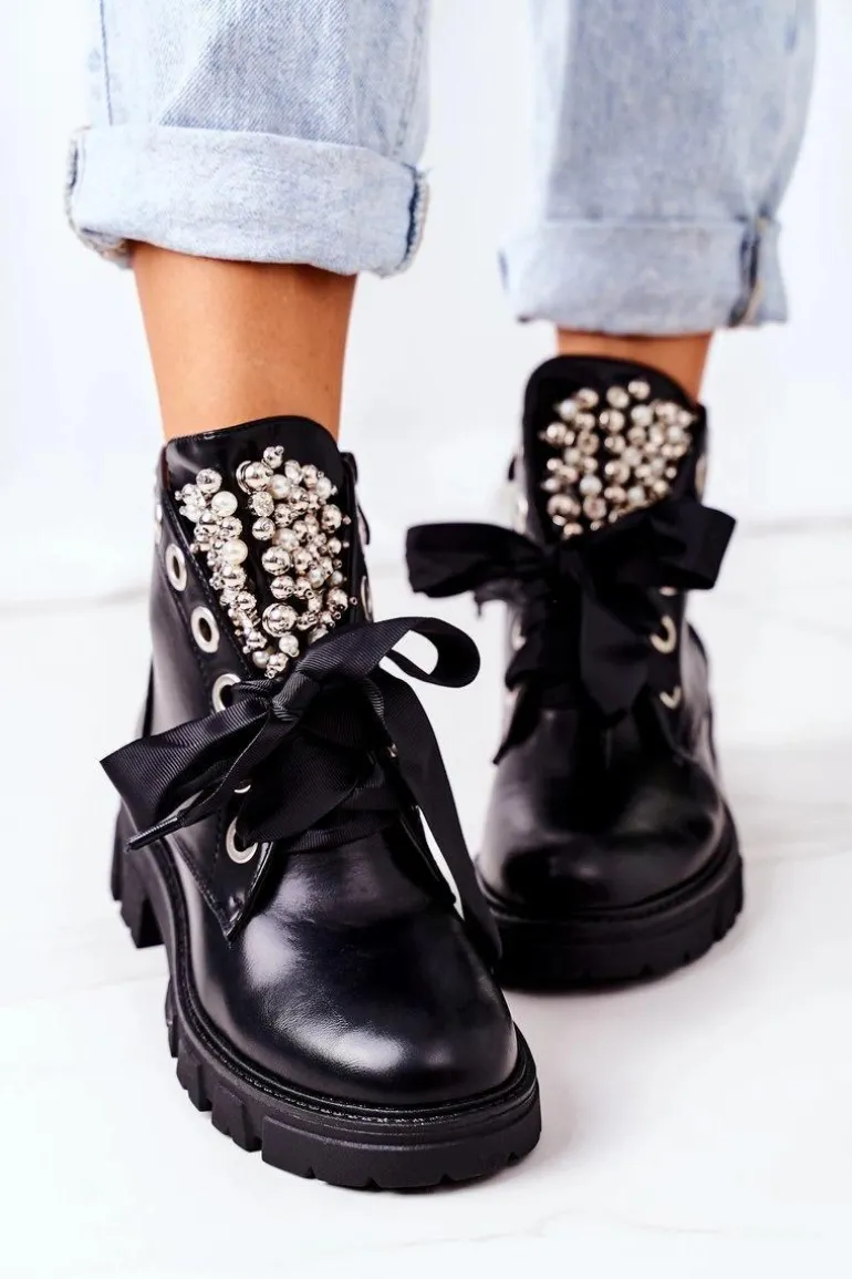 Wyjątkowe botki damskie wykonane z eko skóry. Wnętrze ocieplone jest miłym w dotyku kocem obuwniczym. Model wyróżnia się krojem cholewki oraz ozdobami. Przy wyborze rozmiaru prosimy sugerować się tabelą rozmiarów.