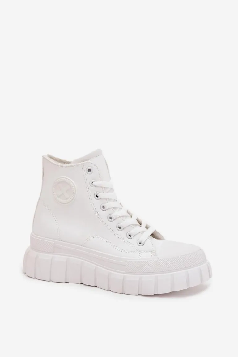 Trampki damskie wykonane ze skóry ekologicznej to połączenie stylu i komfortu. Wysoka cholewka zapinana na zamek oraz sznurowana, co zapewnia idealne dopasowanie do stopy. Buty osadzone są na platformie, co dodaje im modnego charakteru oraz zapewnia wygodę podczas chodzenia. Środek buta ocieplany jest miękkim kocem obuwniczym, co gwarantuje ciepło i komfort przez cały dzień. Zaokrąglone noski dodają trampkom lekkości i subtelności. Idealny wybór na chłodniejsze dni! Przy wyborze rozmiaru prosimy sugerować się tabelą rozmiarów.