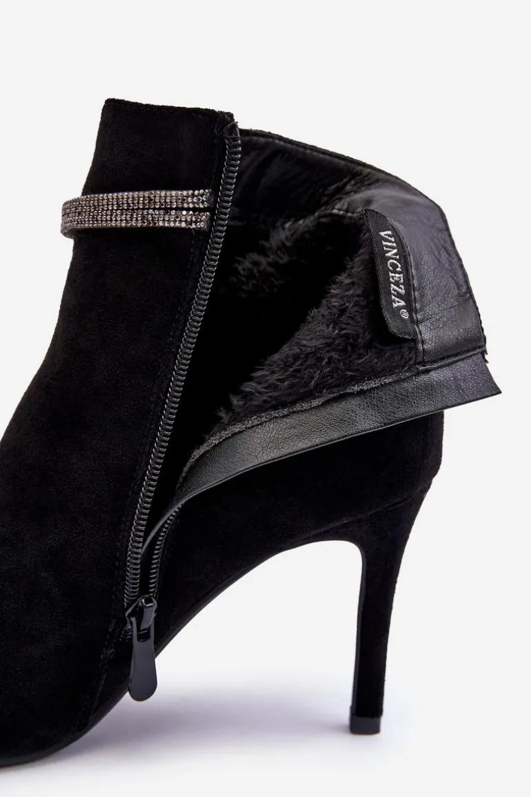 Botki damskie wykonane z eko zamszu. Osadzone na obcasie w postaci szpilki. Na cholewce dwa splecione paseczki, które posiadają liczne, błyszczące dżety. Model zapinany na suwak z boku. Noski w szpic optycznie wysmuklą nogi. Dodatkowo zapiętek jest usztywniony. Botki świetnie sprawdzą się w wielu stylizacjach np.: do sukienek, spódnic czy spodni. Koniecznie powinny znaleźć się w Twojej szafie! Przy wyborze rozmiaru prosimy sugerować się tabelą rozmiarów.