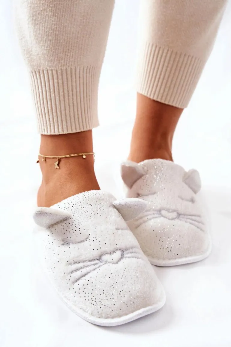 Błyszczące papcie na chłodne dni i wieczory. Wykonane z delikatnego i przyjemnego w dotyku materiału. Na przodzie znajduje się uroczy, wyszyty nosek z wąsami oraz przyszyte uszy. Papcie posiadają ocieplaną wkładkę. Spraw sobie nową parę papci i ciesz się wygodą i ciepłem! Przy wyborze rozmiaru prosimy sugerować się tabelą rozmiarów.