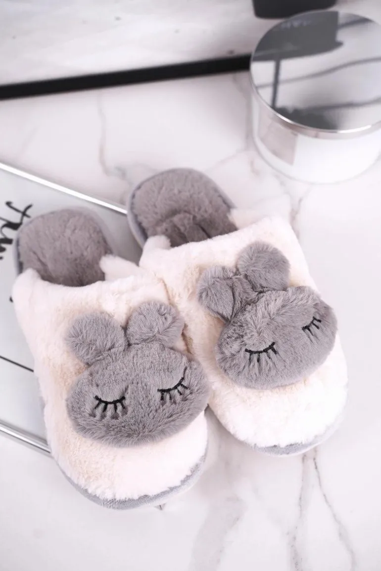 Papcie Damskie Futrzane Biało Szare Rabbit