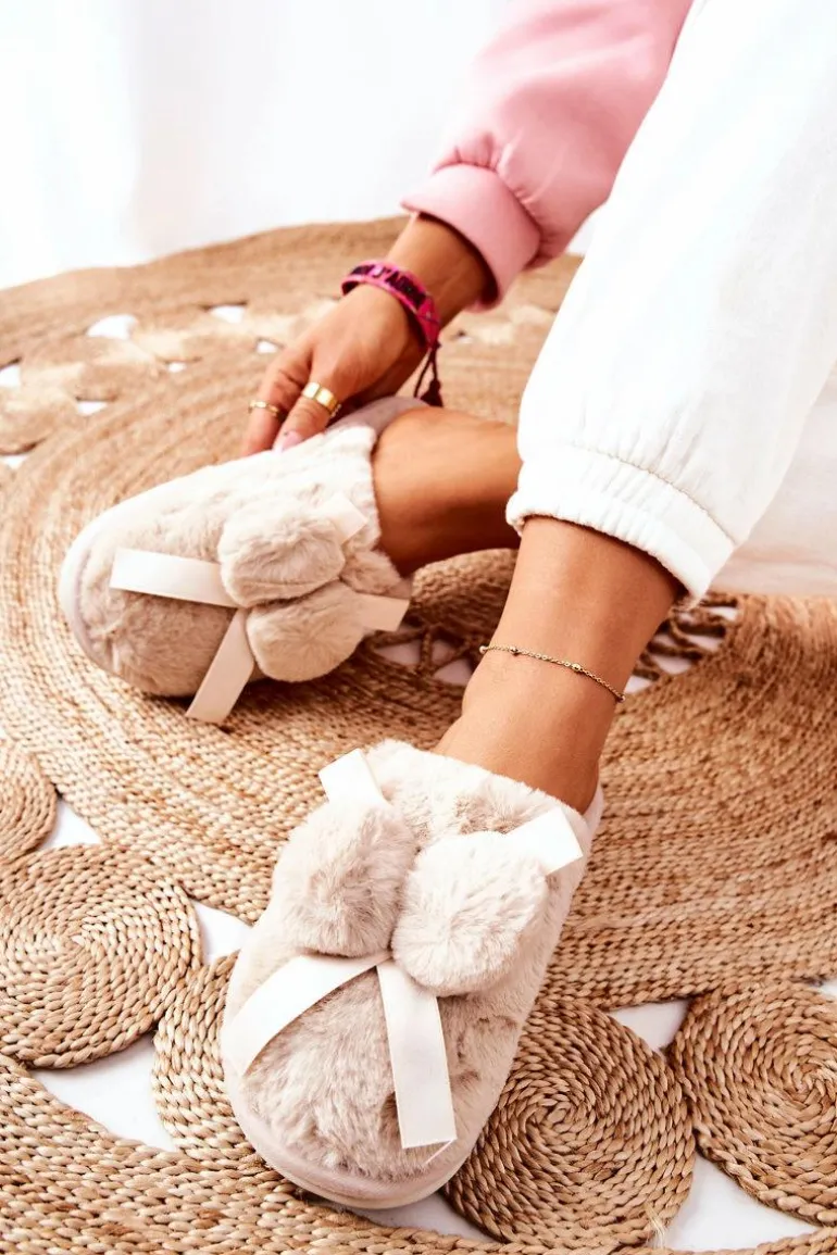 Papcie Futrzane Z Pomponami Beżowe Pamppy