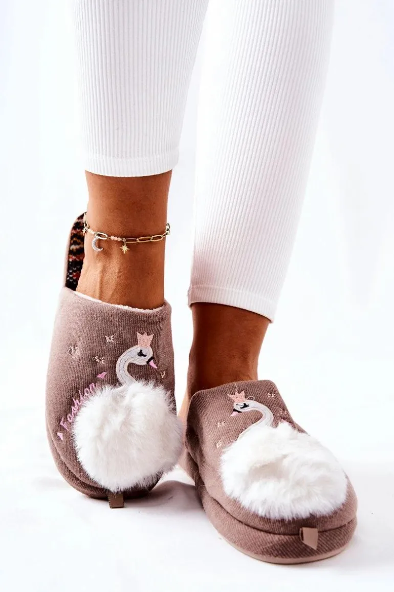 Klasyczne papcie wykonane z materiału. Posiadają ocieplenie w postaci przyjemnego w dotyku koca obuwniczego. Wkładka materiałowa. Z przodu papci widnieje piękny łabędź z futrzanym tułowiem. Posiadają grubą platformę, która świetnie izoluje od zimnego podłoża. Koniecznie musisz je mieć! Przy wyborze rozmiaru prosimy sugerować się tabelą rozmiarów.
