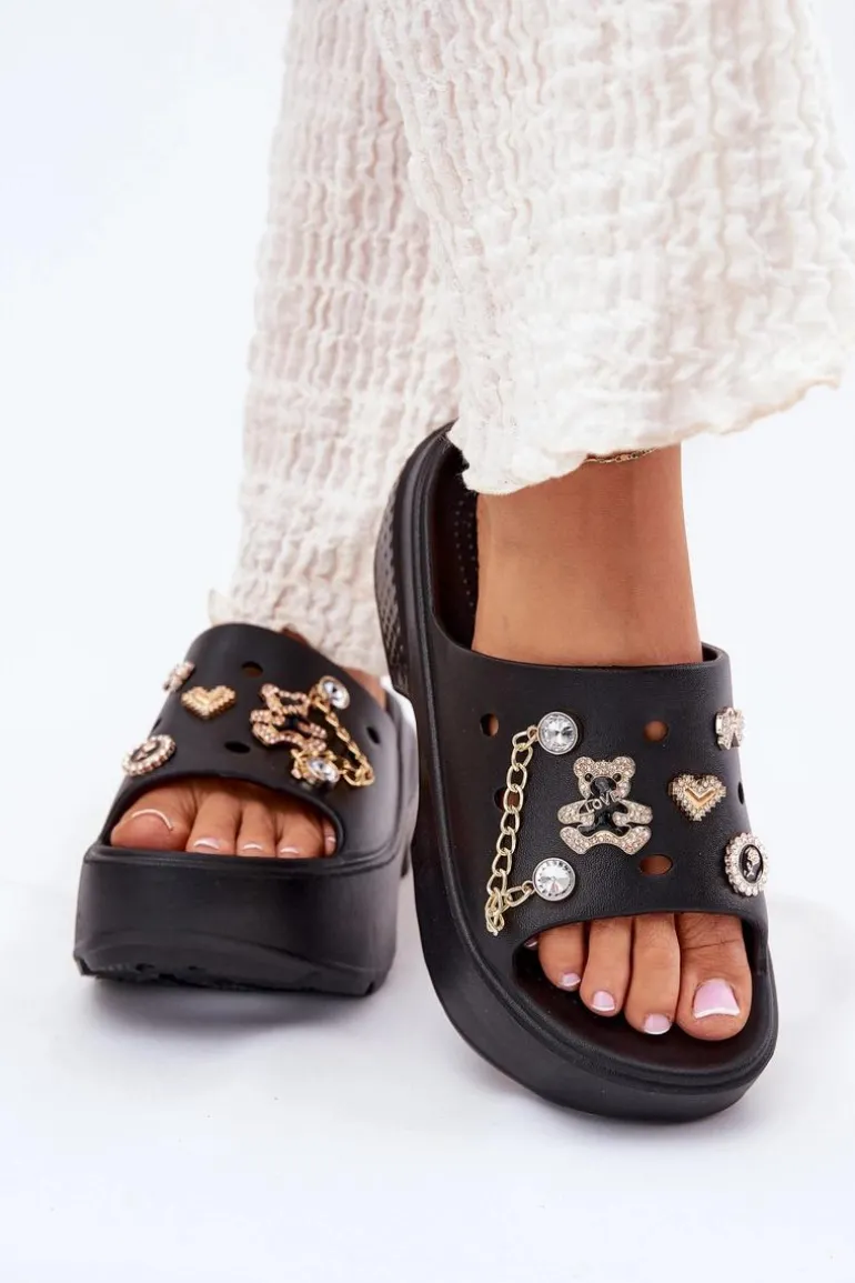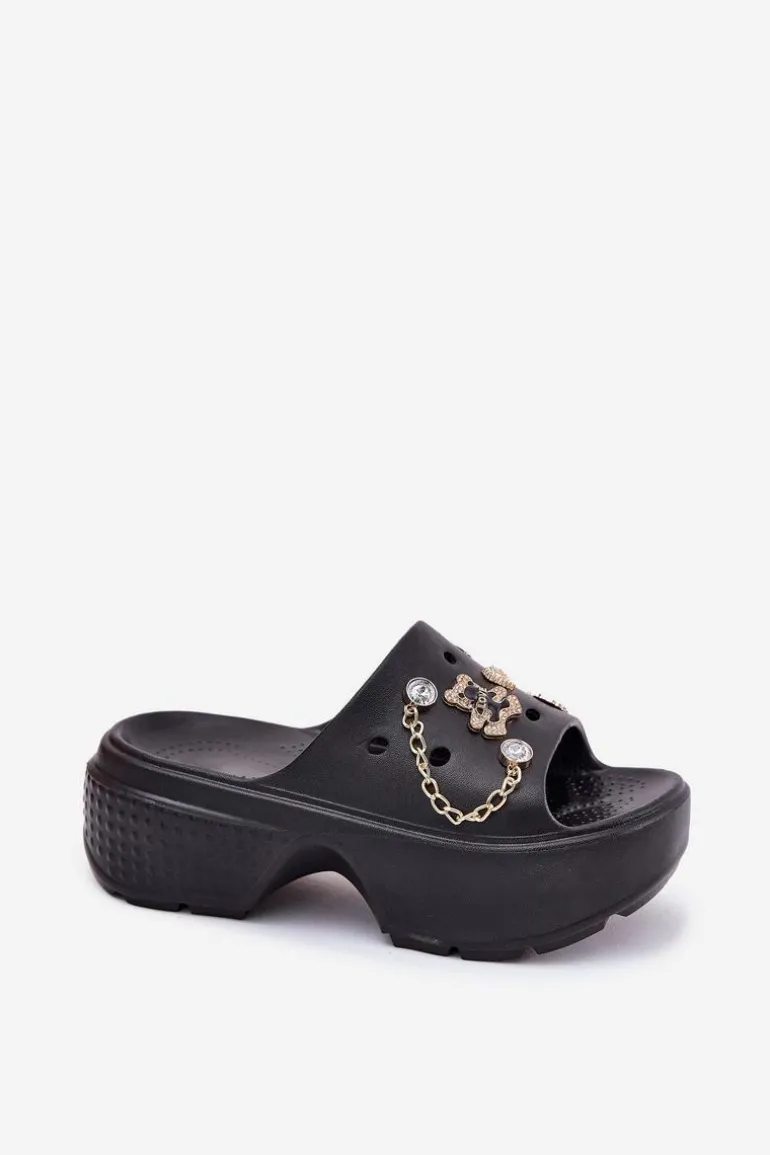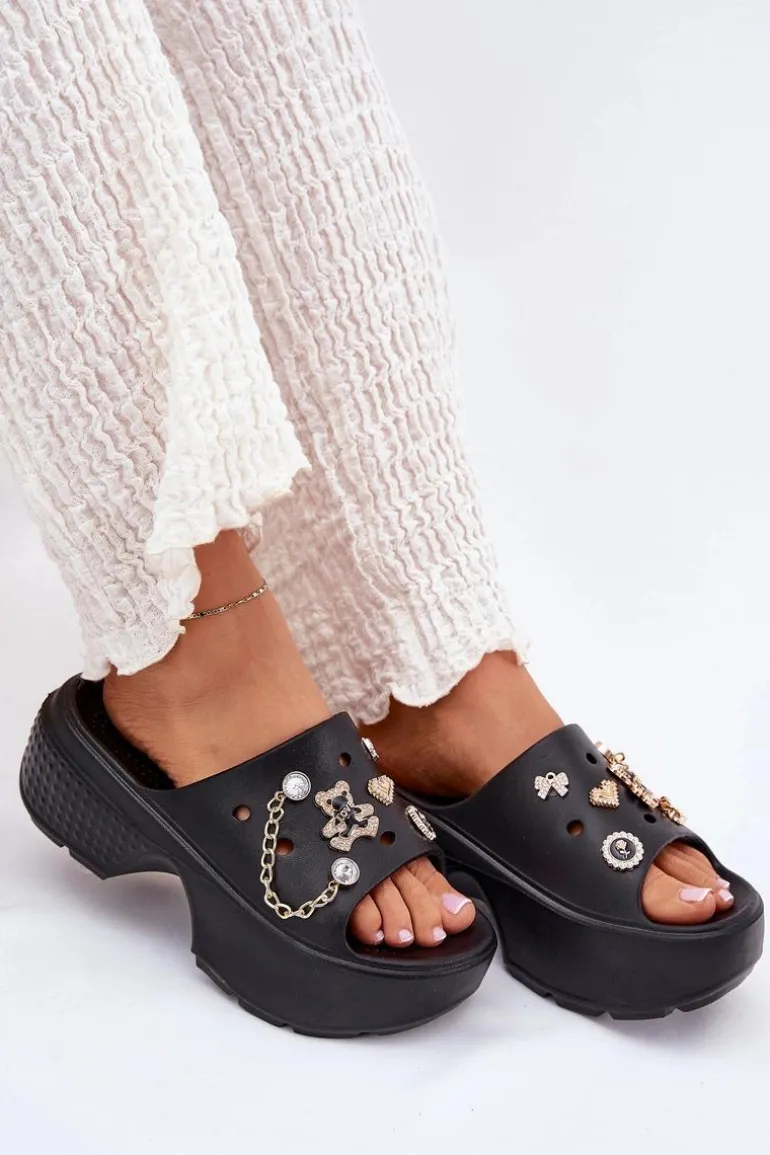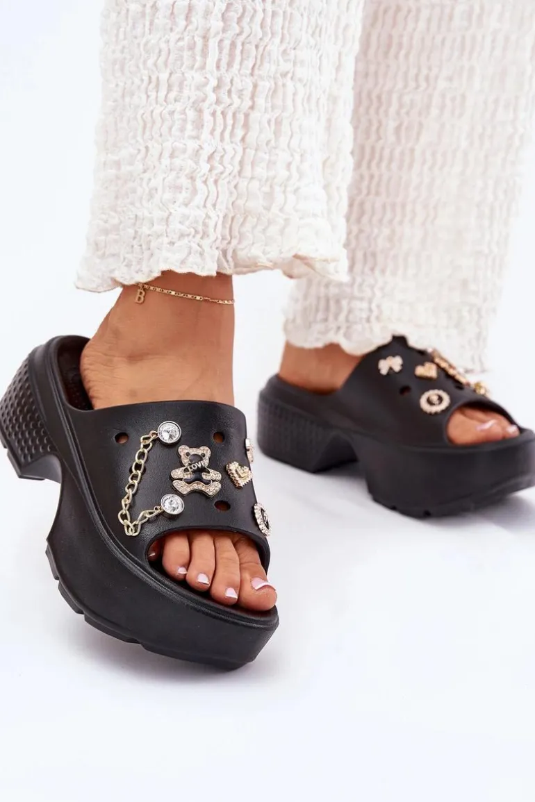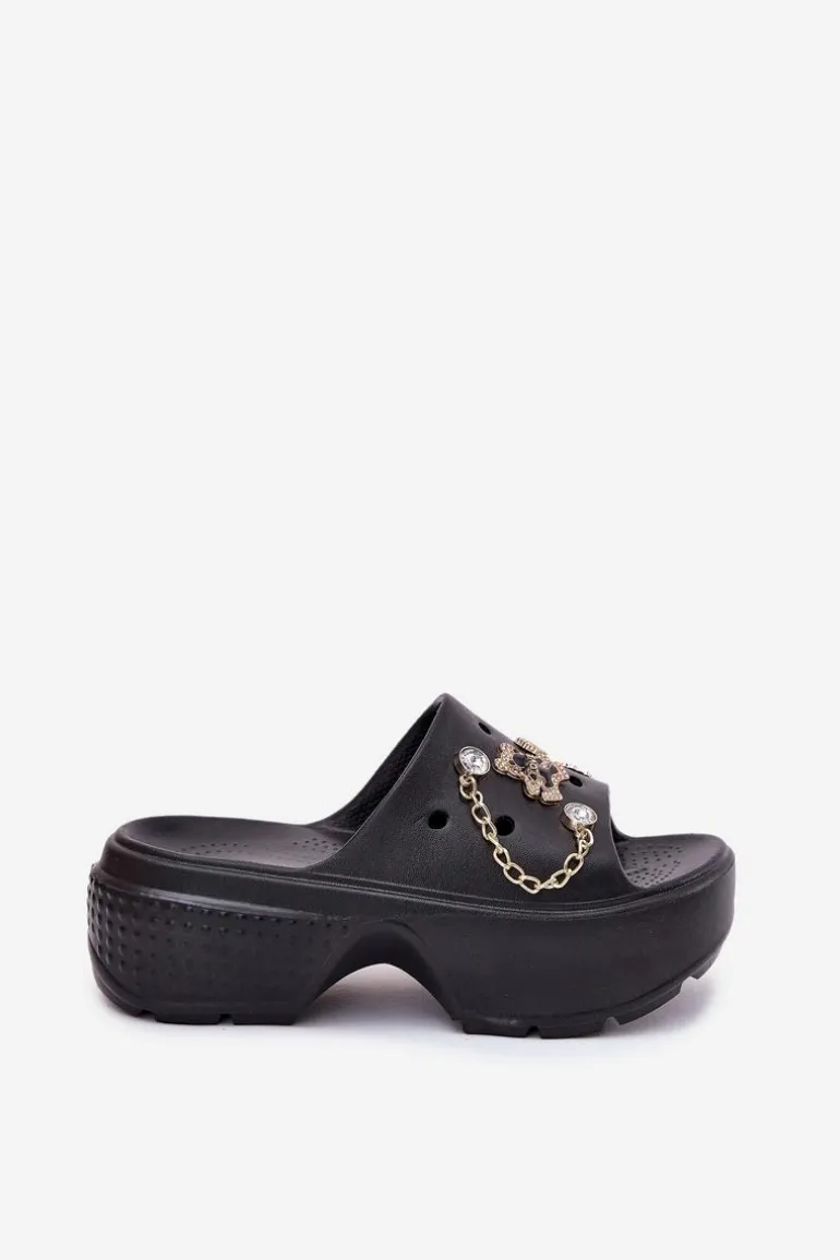 Klapki z piankowego tworzywa na masywnej platformie to świetny wybór na ciepłe dni. Złote przypinki na pasku przyciągają wzrok, nadając im stylowego charakteru. Idealne na co dzień, łączą komfort z modnym wyglądem. Przy wyborze rozmiaru prosimy sugerować się tabelą rozmiarów.