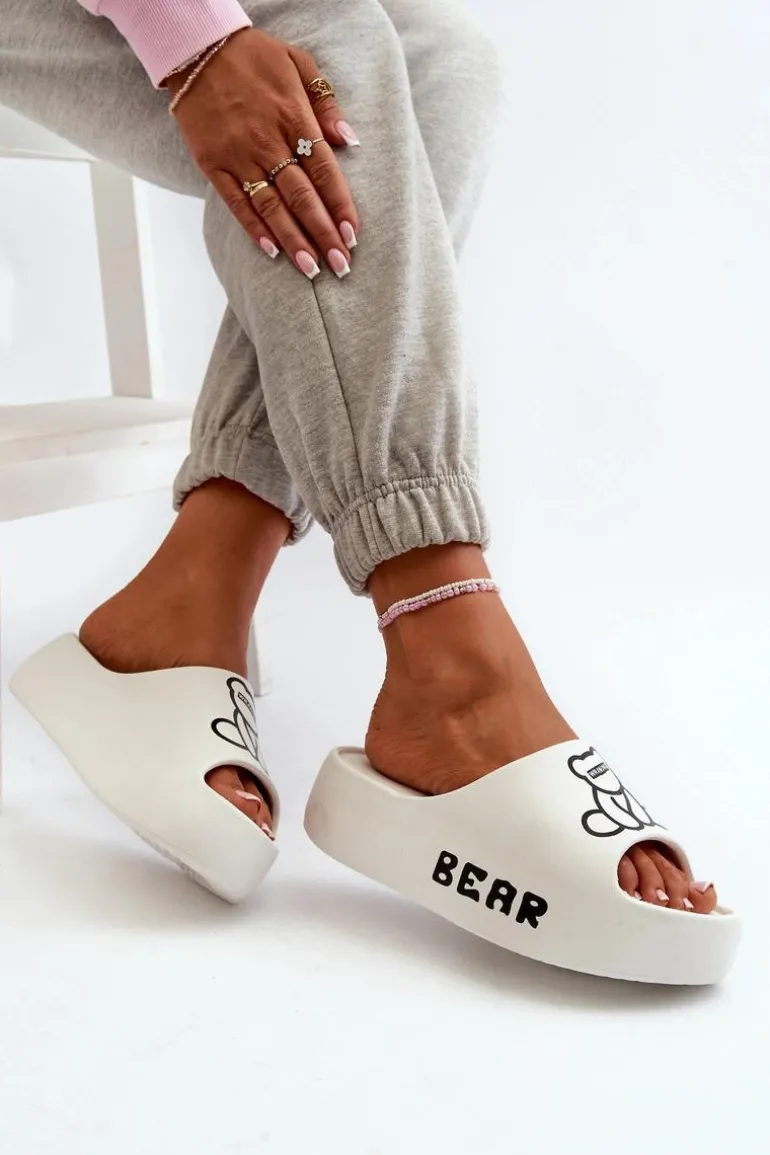 Piankowe Klapki Damskie Na Masywnej Podeszwie Z Misiem Białe Lamira