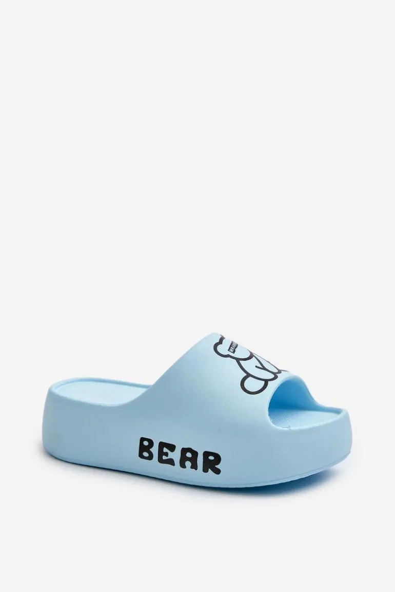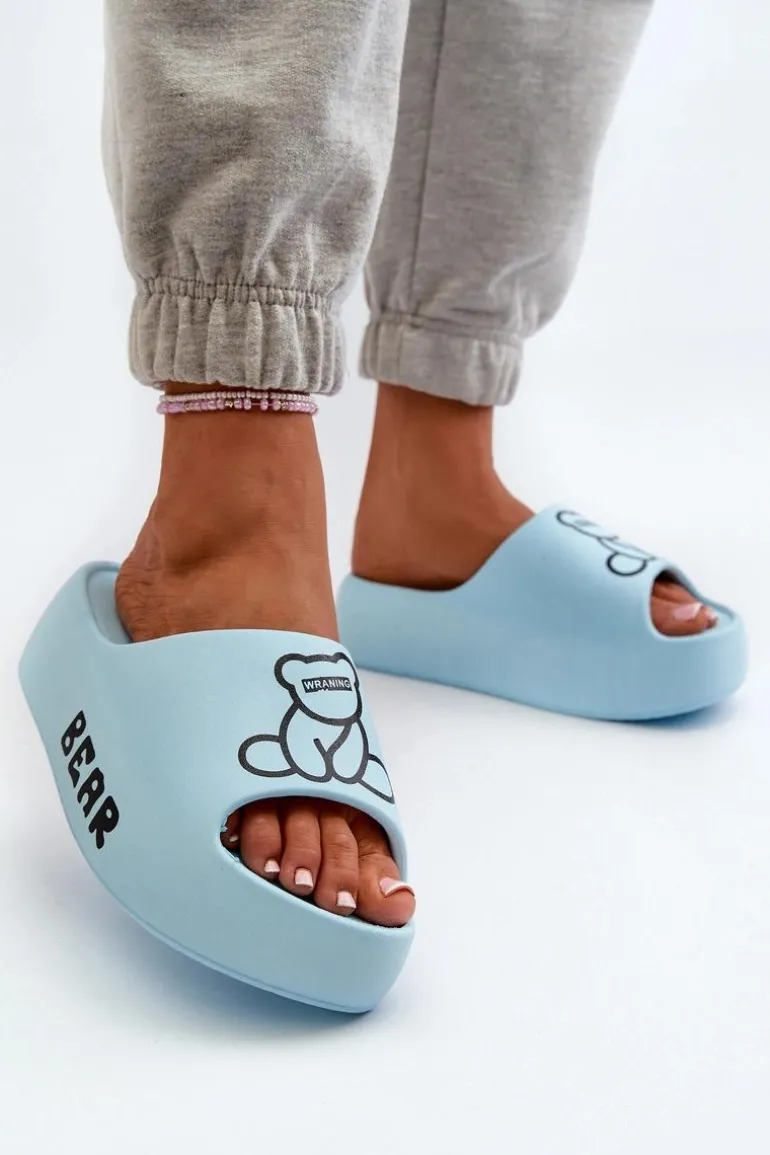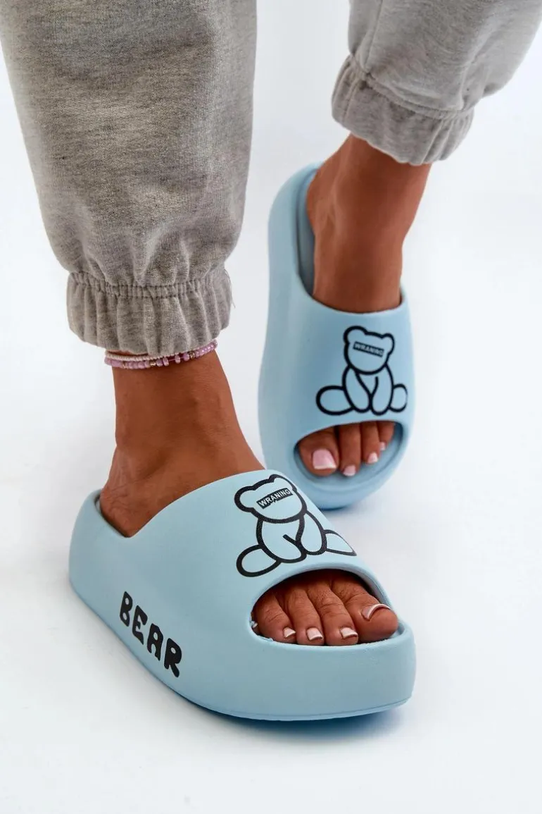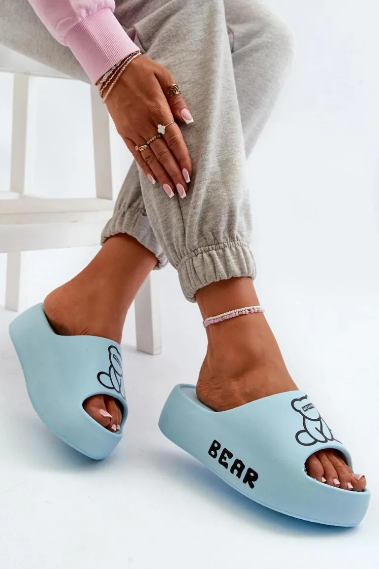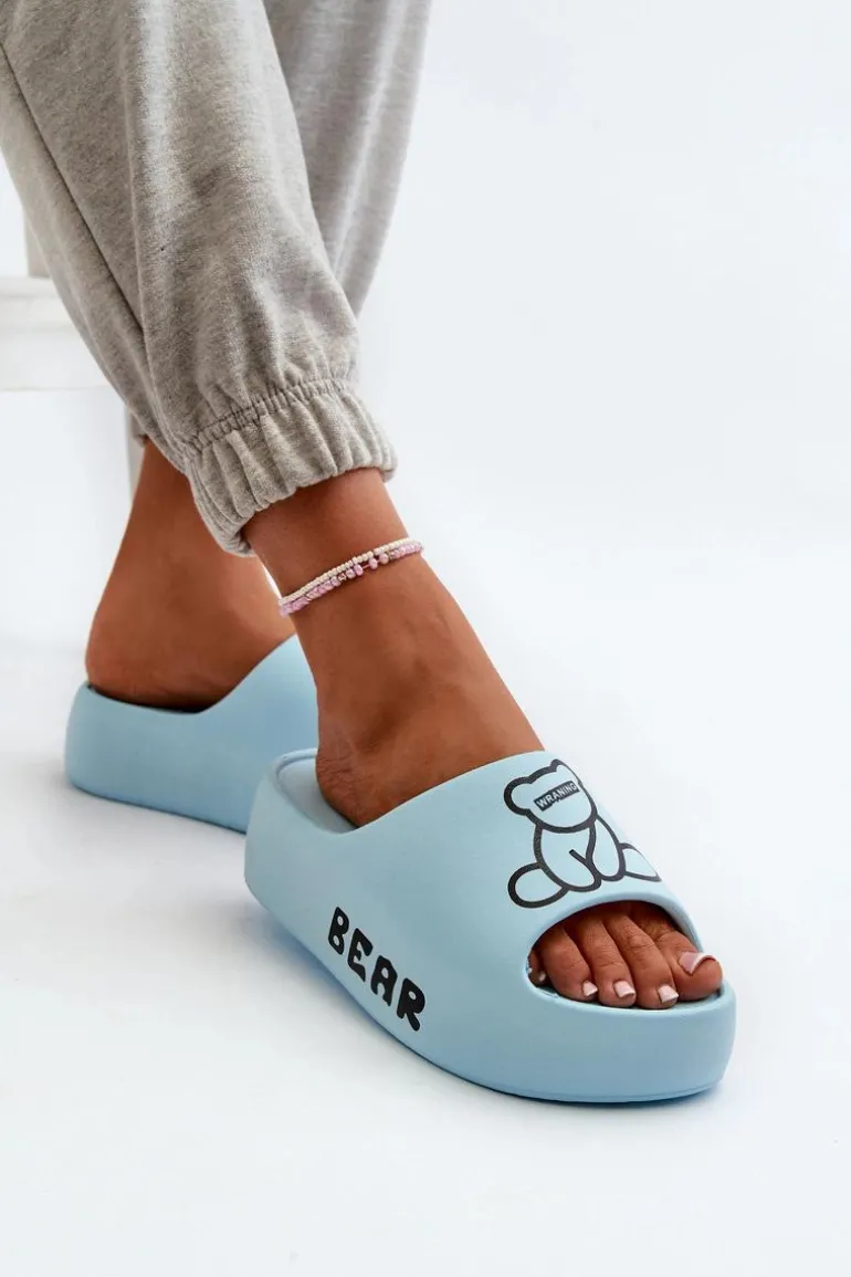 Piankowe Klapki Damskie Na Masywnej Podeszwie Z Misiem Niebieskie Lamira