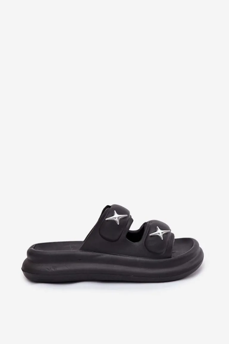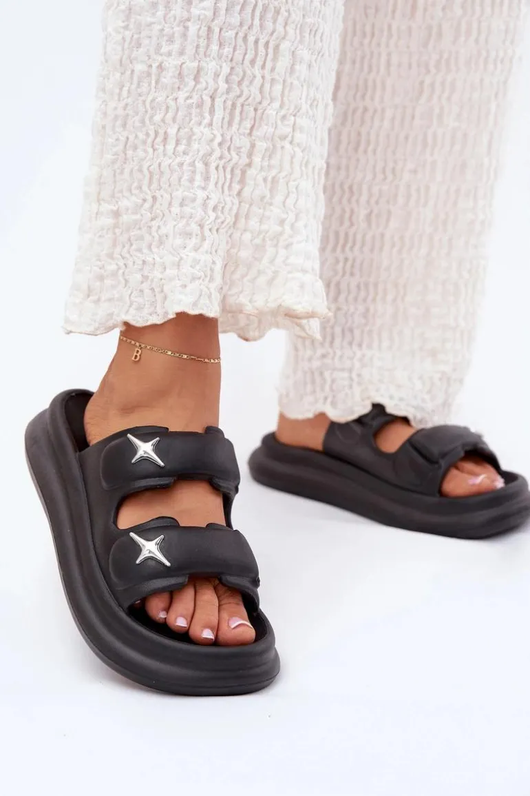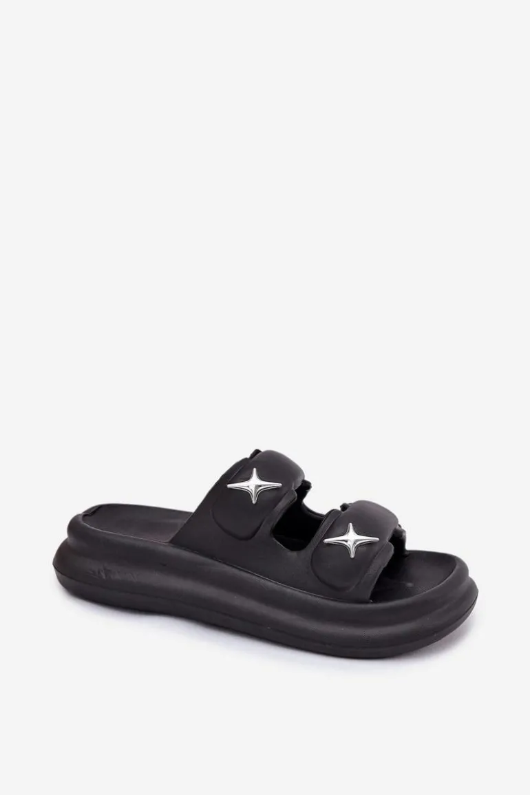 Klapki damskie z piankowego tworzywa, lekkie i osadzone na platformie, to doskonały wybór na ciepłe dni. Dwa paski ozdobione srebrnymi przypinkami dodają im modnego charakteru. Idealne na basen, codzienne wyjścia oraz wakacyjne wyjazdy. Przy wyborze rozmiaru prosimy sugerować się tabelą rozmiarów.