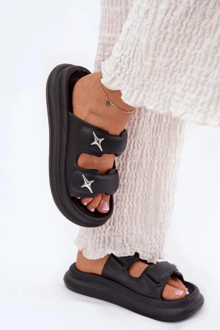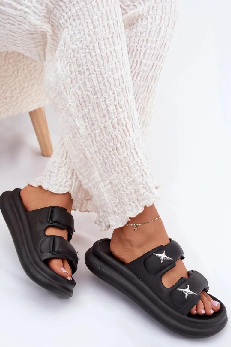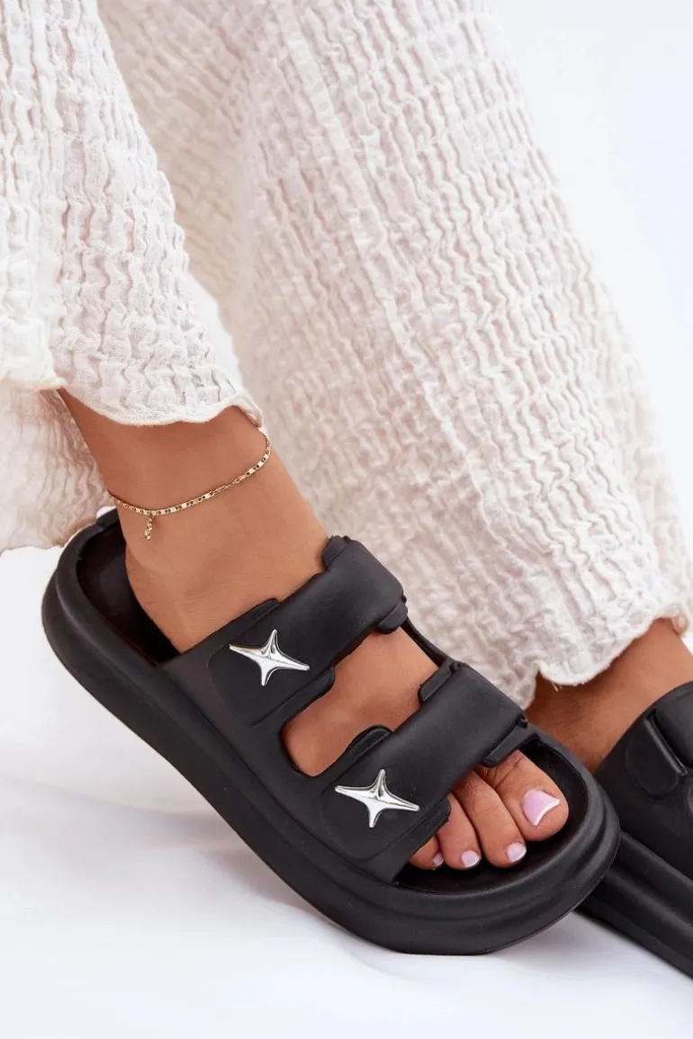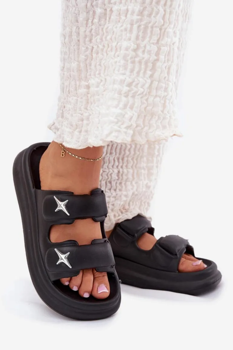 Klapki damskie z piankowego tworzywa, lekkie i osadzone na platformie, to doskonały wybór na ciepłe dni. Dwa paski ozdobione srebrnymi przypinkami dodają im modnego charakteru. Idealne na basen, codzienne wyjścia oraz wakacyjne wyjazdy. Przy wyborze rozmiaru prosimy sugerować się tabelą rozmiarów.
