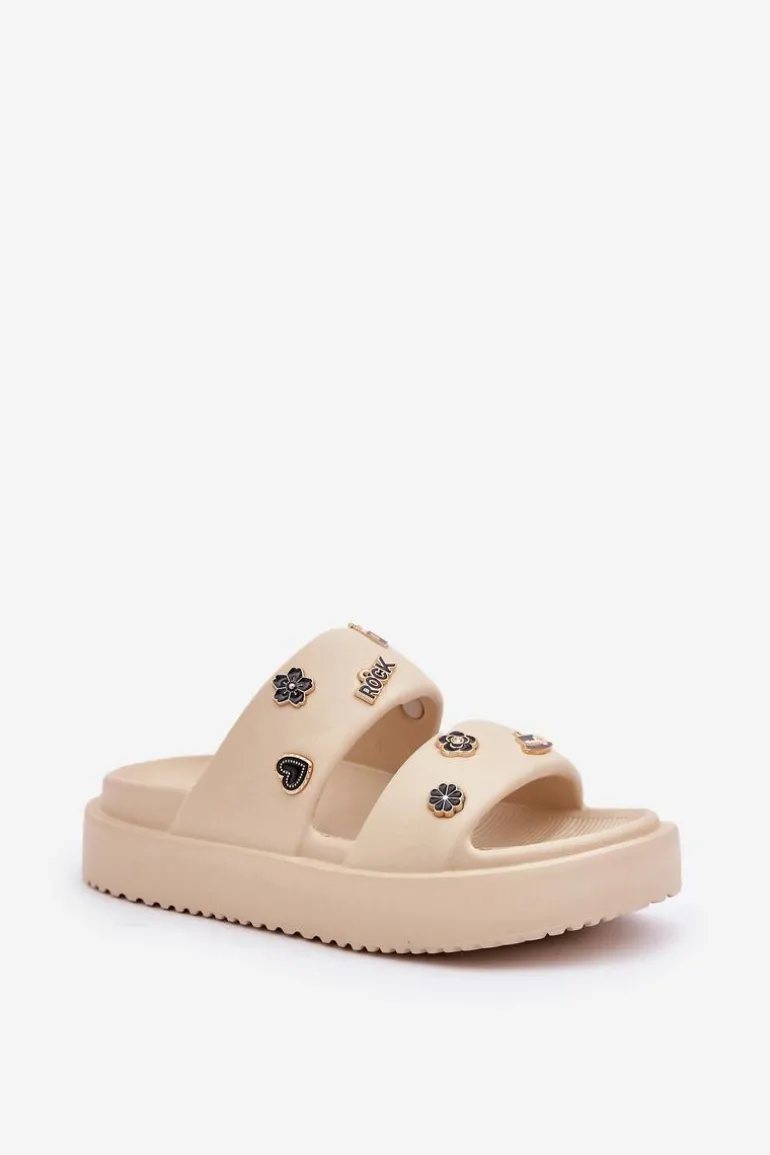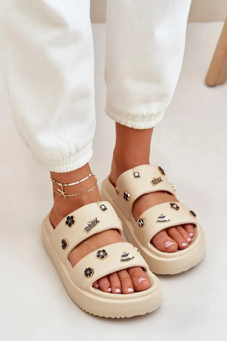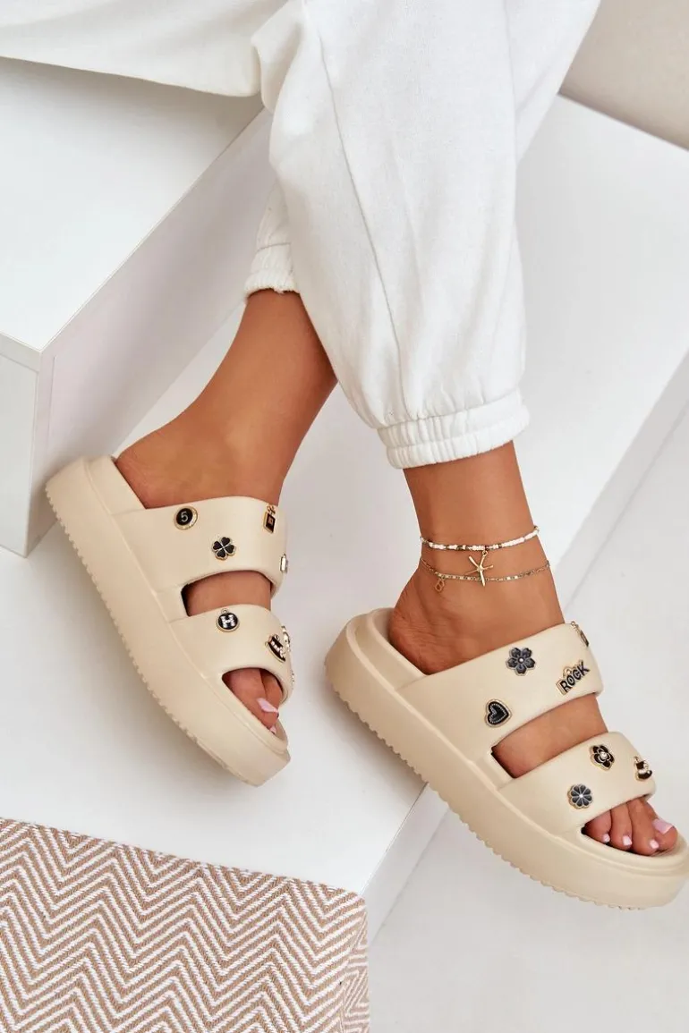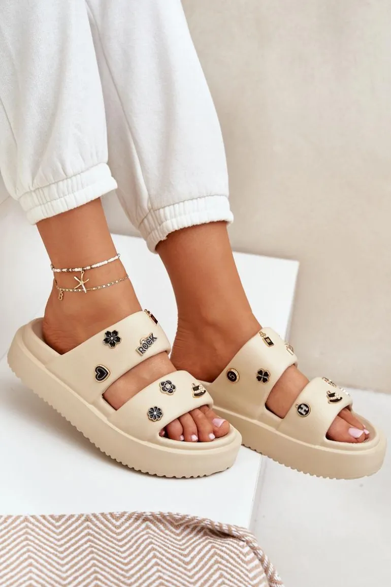 Damskie klapki z lekkiej pianki to stylowy wybór dla każdej kobiety. Platforma gwarantuje wygodę oraz stabilność. Klapki są ozdobione detalami, które przyciągają uwagę, doskonale pasując do letnich zestawień, łącząc komfort z modnym stylem. Przy wyborze rozmiaru prosimy sugerować się tabelą rozmiarów.