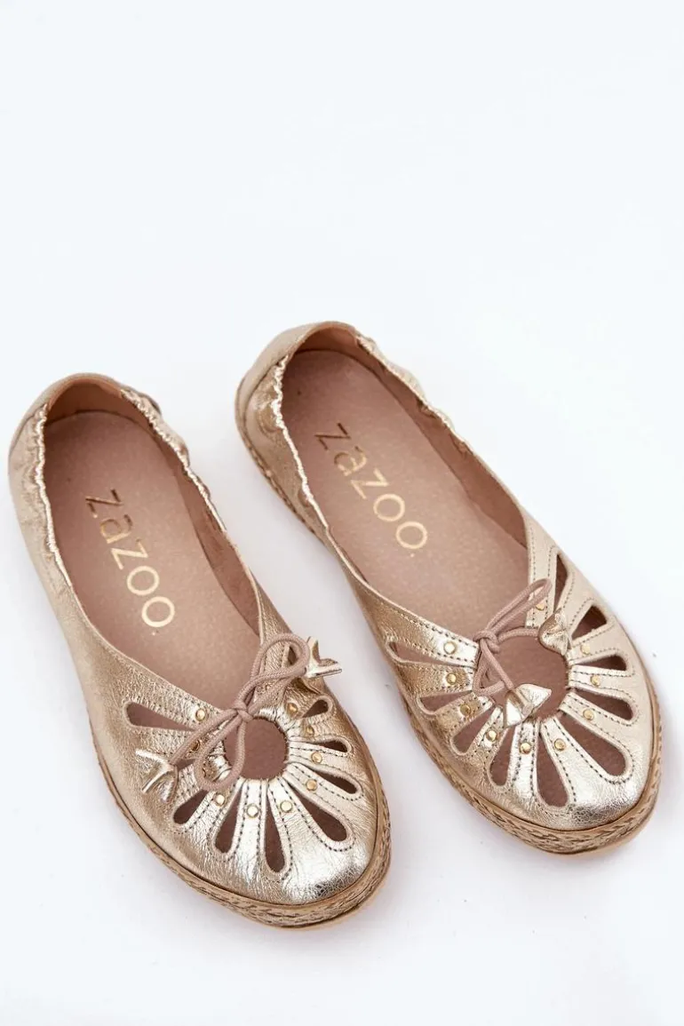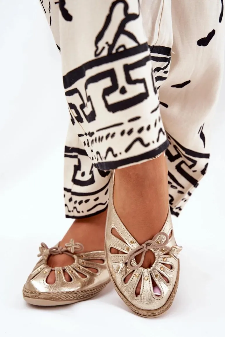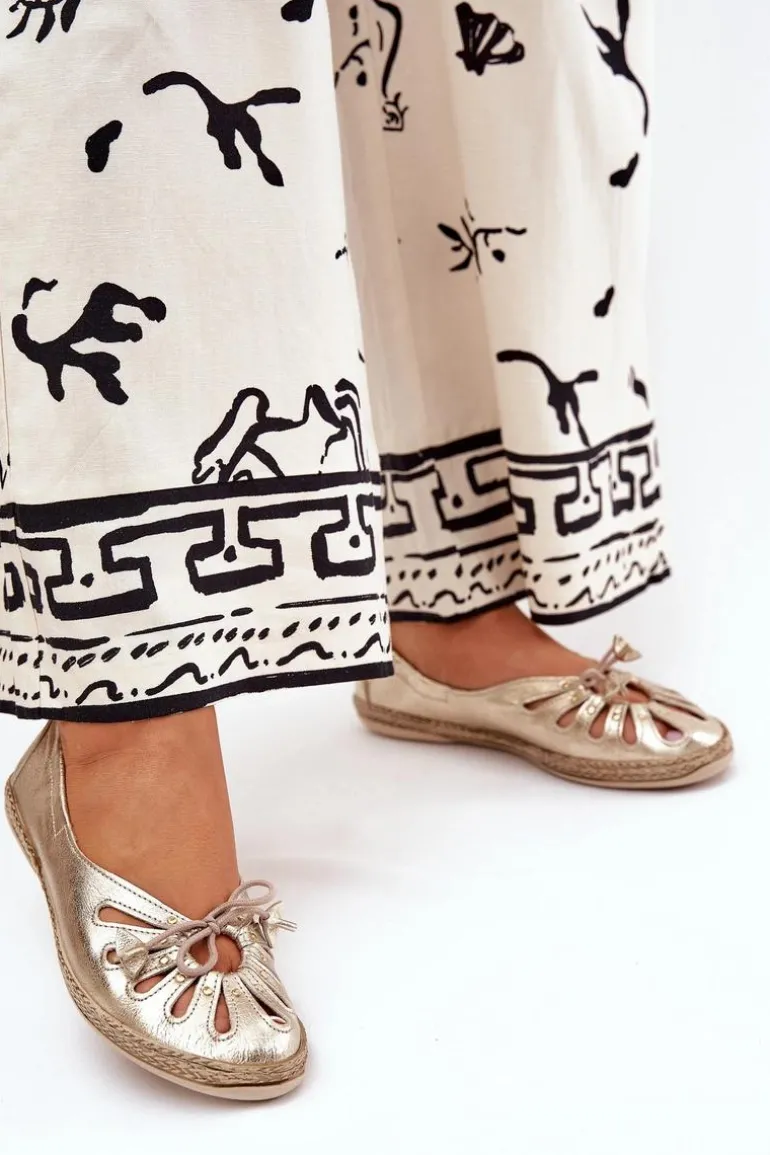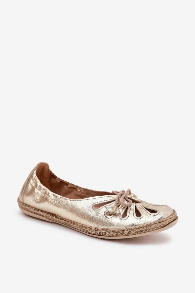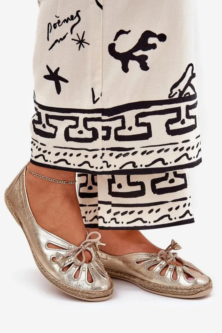 Płaskie baleriny z naturalnej skóry to elegancka i komfortowa propozycja na co dzień. Model ten wyróżnia subtelne wiązanie oraz wycięcia, co nadaje im delikatnego, kobiecego charakteru. Te baleriny będą doskonałym wyborem do casualowych stylizacji, łącząc elegancję z komfortem. Przy wyborze rozmiaru prosimy sugerować się tabelą rozmiarów.