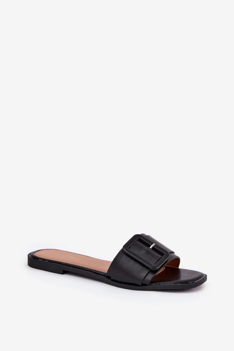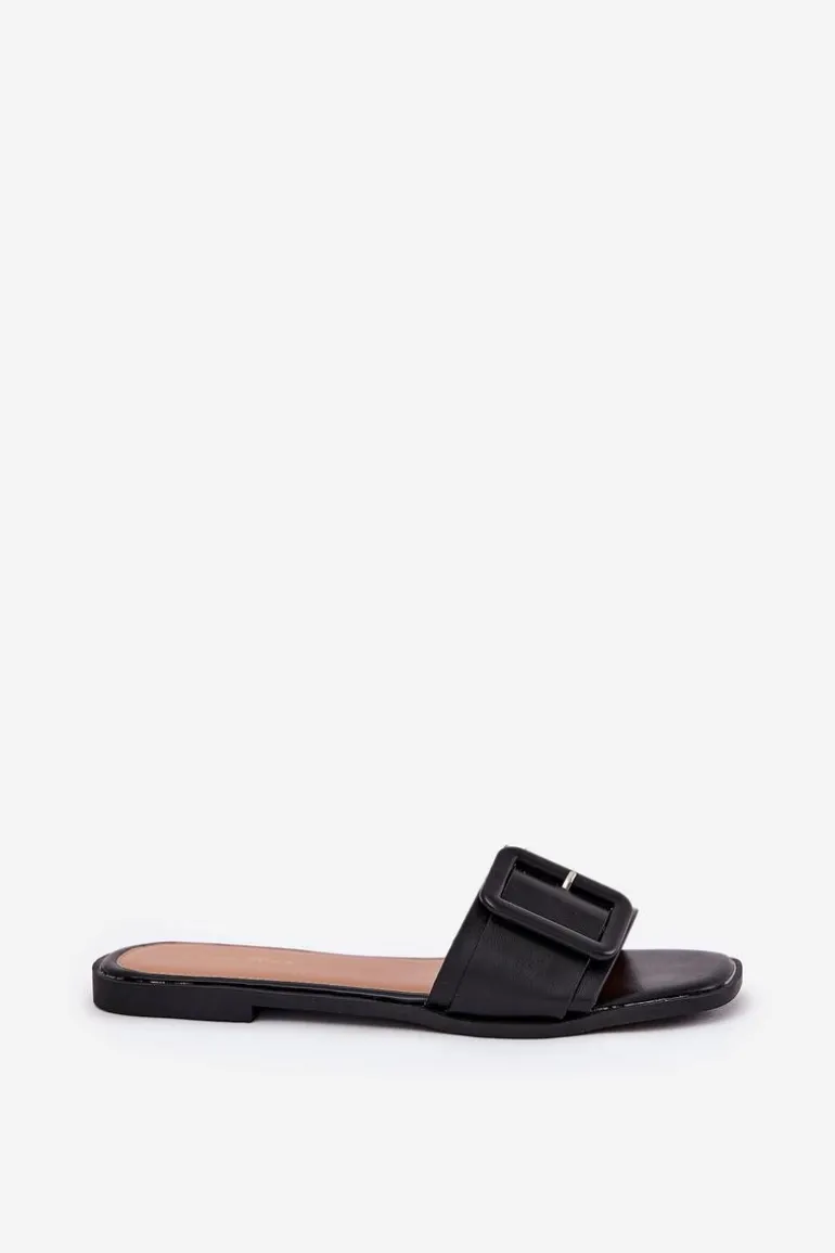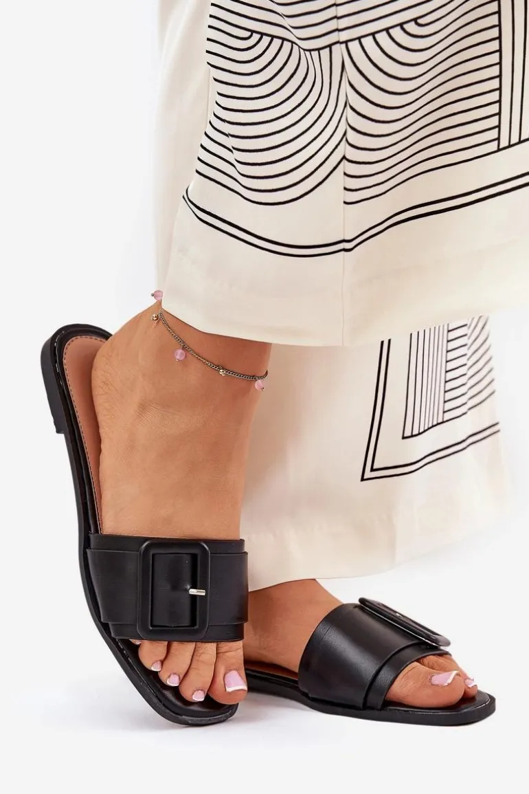 Płaskie Klapki Damskie Eko Skórzane Z Klamrą Czarne Bamma