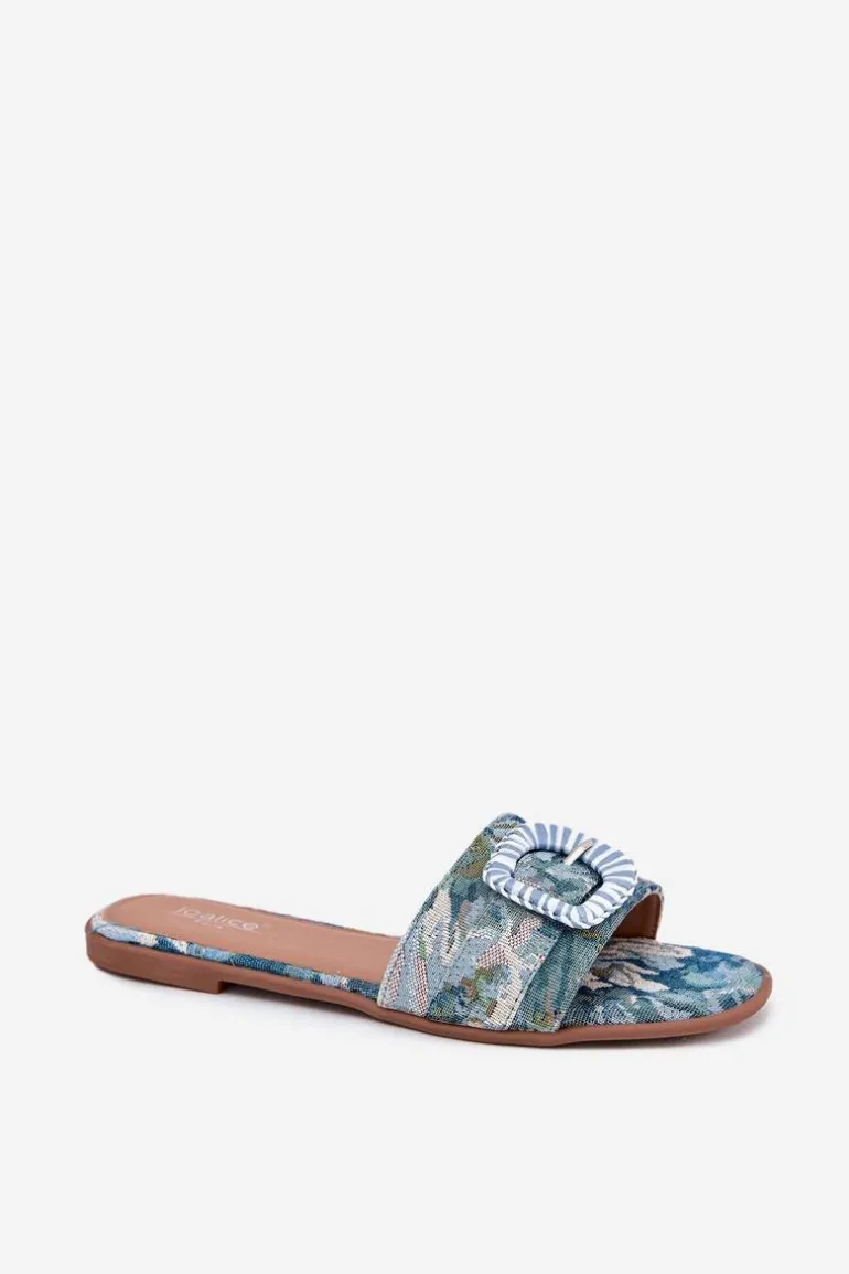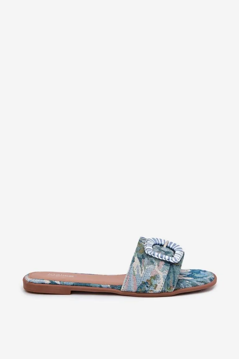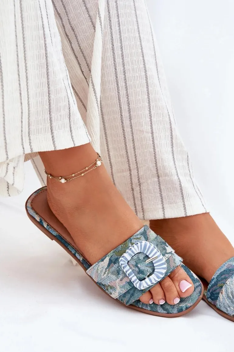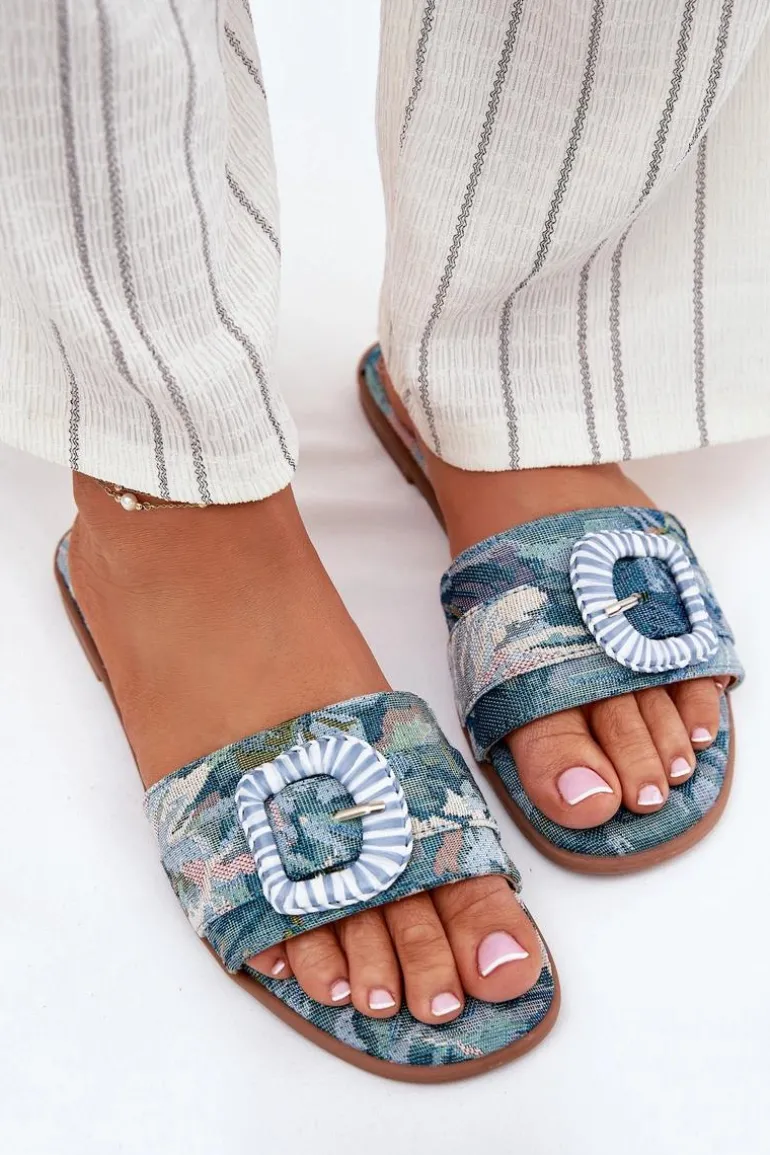 Klapki damskie na płaskim obcasie, wykonane z materiału tekstylnego. Z przodu wyróżnia je ozdobna klamra, która dodaje stylu i elegancji. To doskonały wybór na letnie dni – lekkie, wygodne i modne, świetnie sprawdzą się na co dzień. Przy wyborze rozmiaru prosimy sugerować się tabelą rozmiarów.