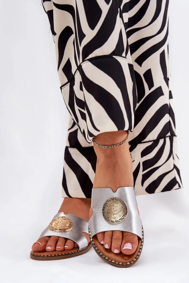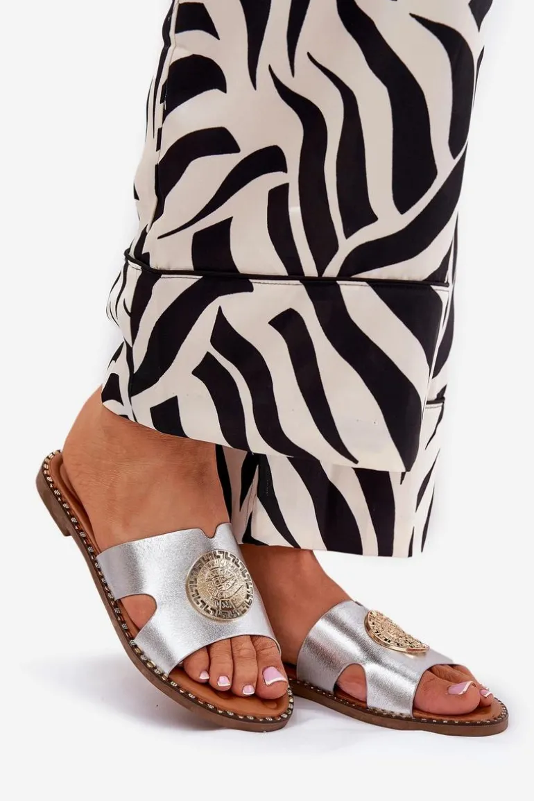 Płaskie Klapki Damskie Z Ozdobnym Detalem Srebrne Oferry