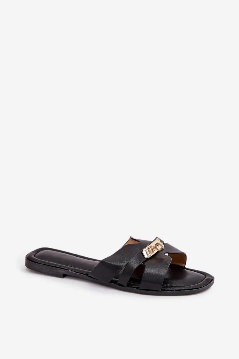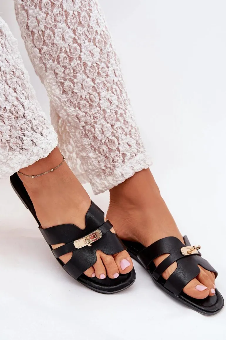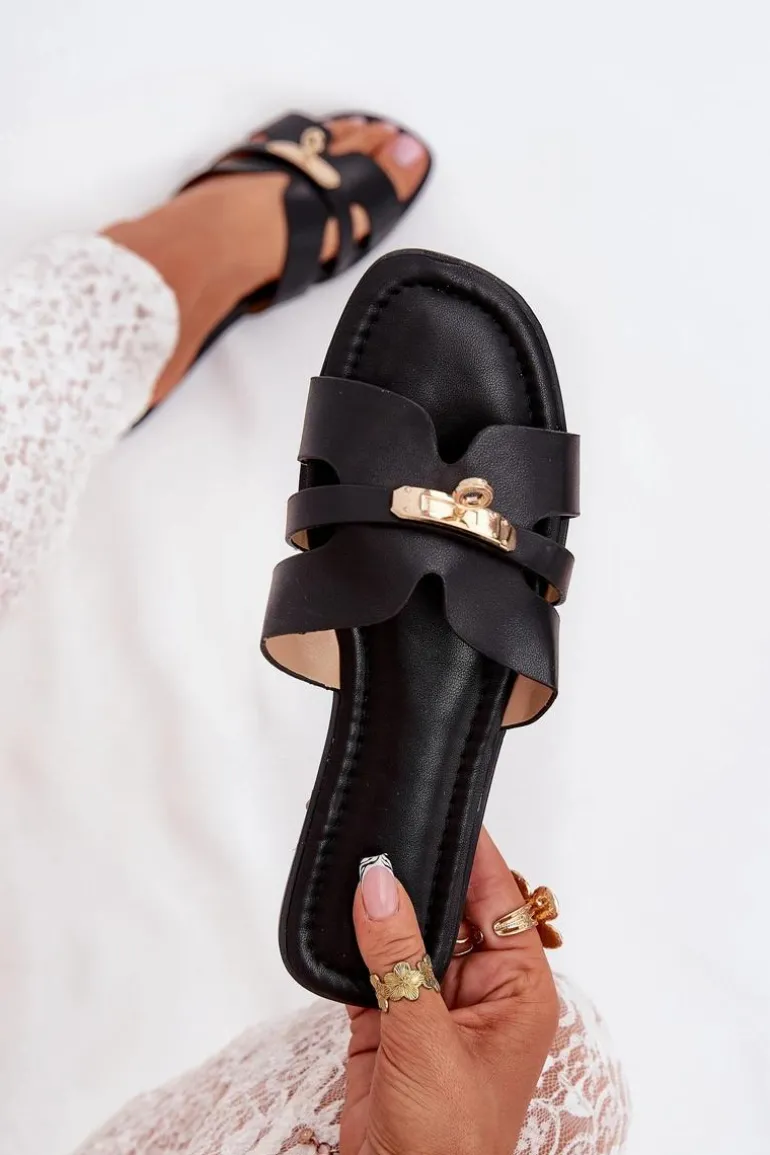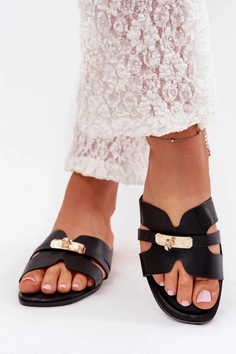 Płaskie Klapki Damskie Z Paseczkiem I Złotym Detalem Czarne Kerenza