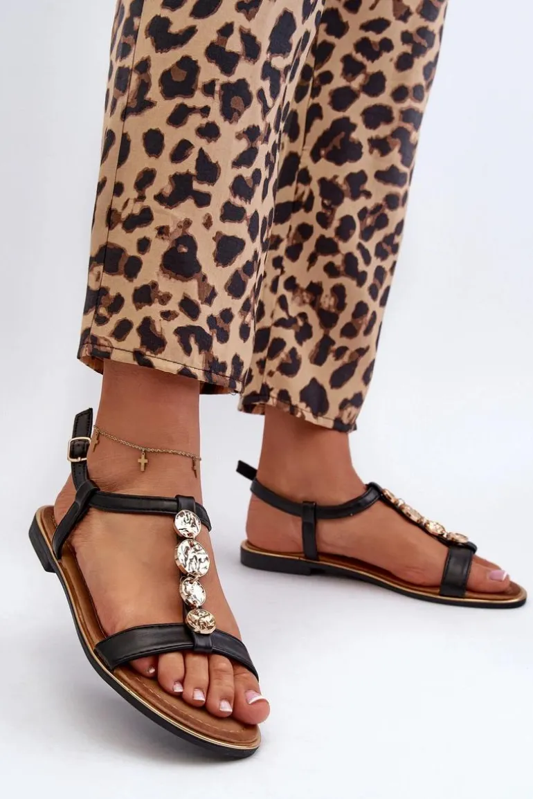Sandały damskie z subtelnymi złotymi ozdobami. Wykonane z eko skóry. Osadzone na płaskim obcasie. Zapinane na regulowany pasek ze sprzączką, są zarówno modne, jak i wygodne. Idealne do codziennych stylizacji. Przy wyborze rozmiaru prosimy sugerować się tabelą rozmiarów.