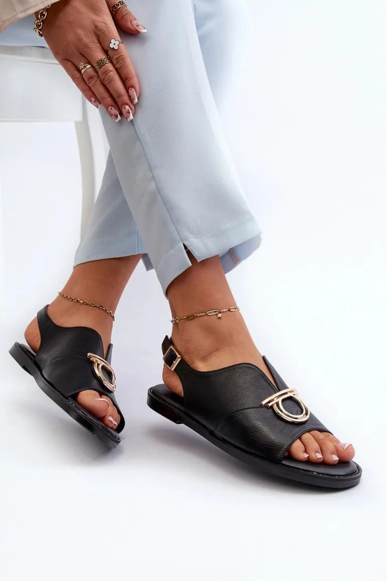 Sandały damskie płaskie to idealne połączenie stylu i wygody. Wykonane z wysokiej jakości eko skóry. Złota ozdoba dodaje im elegancji i wyjątkowego charakteru. Zapinane na regulowany pasek ze sprzączką, gwarantują idealne dopasowanie do stopy. Przy wyborze rozmiaru prosimy sugerować się tabelą rozmiarów.