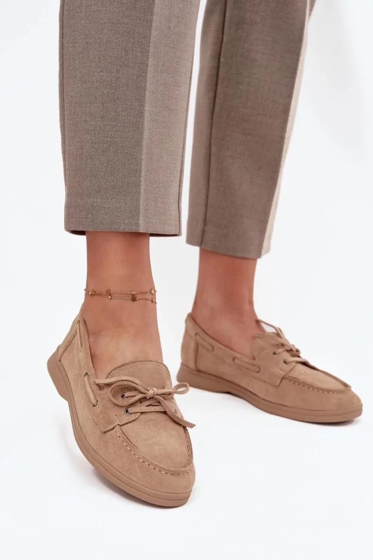 Mokasyny damskie wykonane z miękkiego eko zamszu to wygodna i stylowa propozycja na co dzień. Osadzone na płaskiej podeszwie gwarantują komfort, a zaokrąglone noski nadają im klasyczny charakter. Subtelny paseczek z przodu i wokół cholewki stanowi ciekawy detal, który podkreśla elegancki i ponadczasowy wygląd tego modelu. Doskonałe do codziennych stylizacji. Przy wyborze rozmiaru prosimy sugerować się tabelą rozmiarów.