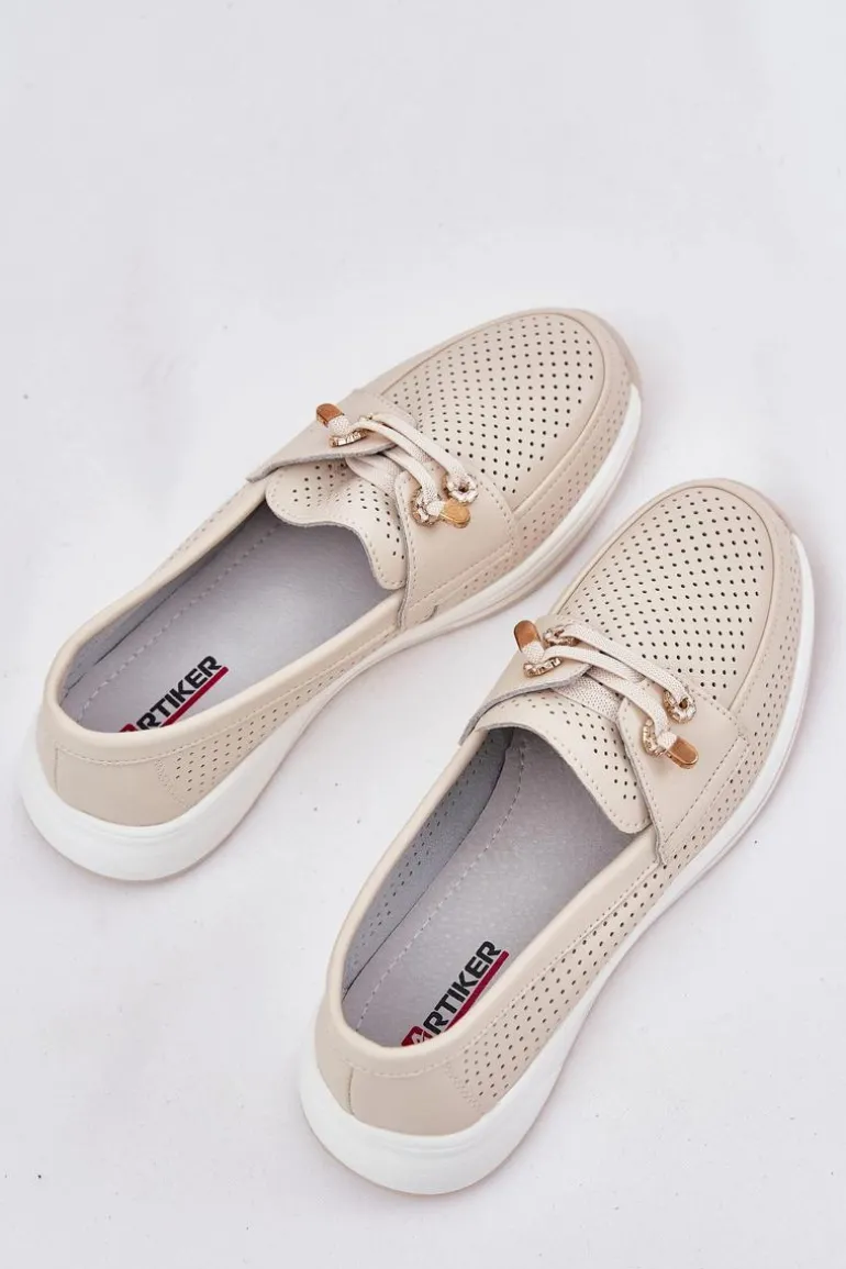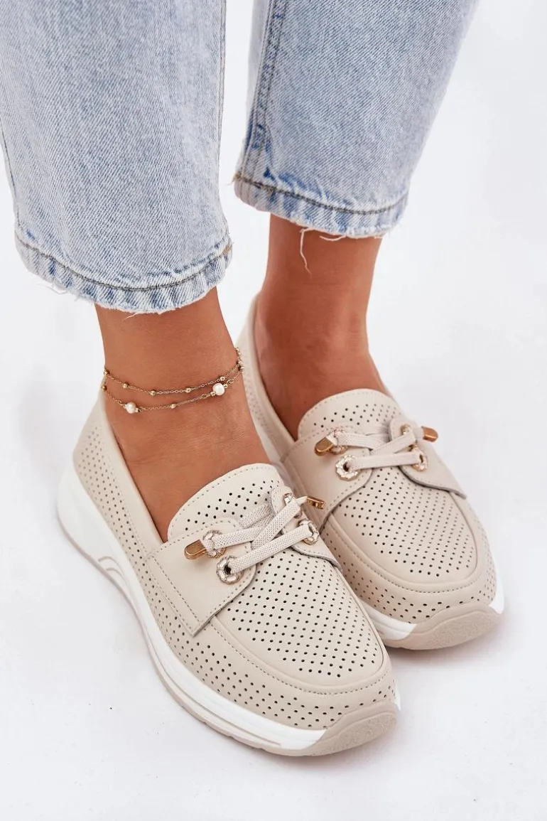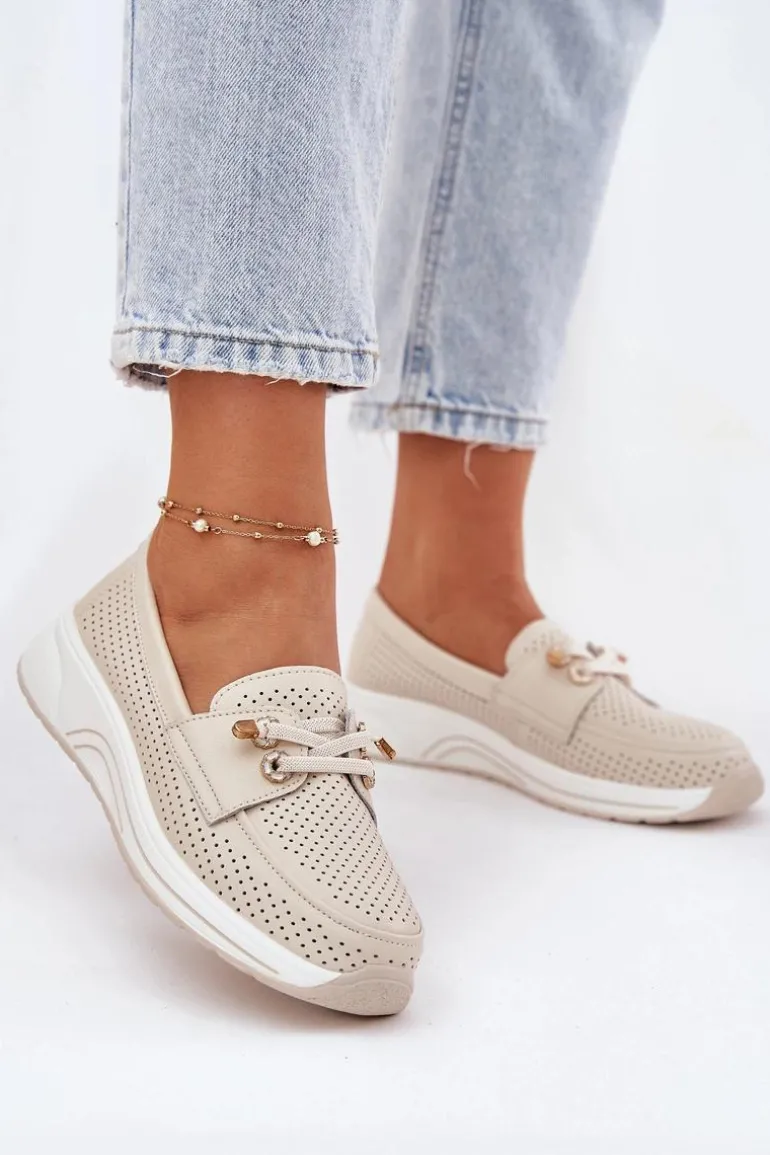 Półbuty damskie wykonane z naturalnej skóry to połączenie elegancji i wygody. Osadzone na platformie, zapewniają stabilność i komfort przez cały dzień. Model posiada gumki imitujące sznurówki z ozdobnymi przypinkami, które nadają oryginalnego charakteru. Zaokrąglone noski zapewniają wygodę, a miękka wkładka dodatkowo dba o komfort stóp. Lekkie i wygodne, te półbuty będą doskonałym wyborem do codziennych stylizacji, łącząc funkcjonalność z modnym wyglądem. Przy wyborze rozmiaru prosimy sugerować się tabelą rozmiarów.