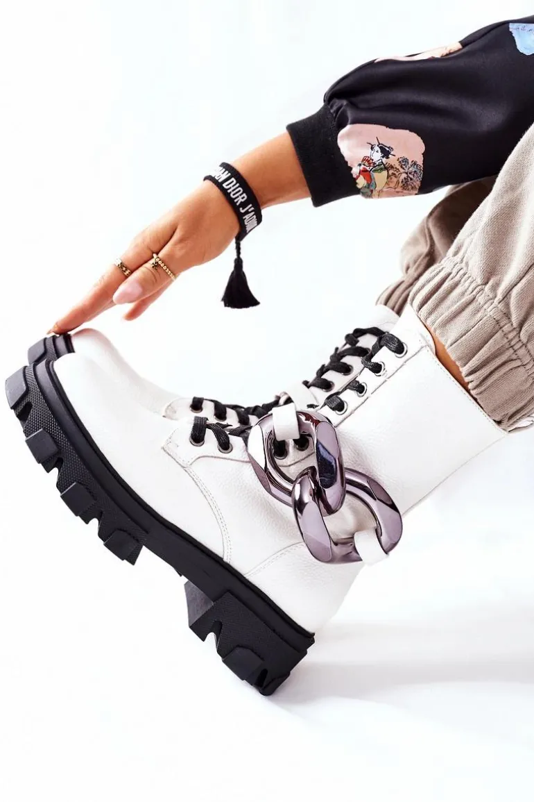 Szukasz mocniejszego stylu? Dobrze trafiłaś, bo te botki spełniają Twoje wymagania! Noś na różne sposoby, ozdobę – łańcuch możesz dowolnie odpiąć. Wysoka cholewka oraz masywna podeszwa – co tu więcej dodawać? Klasyczny fason ze sznurowaniem. Odporna na zabrudzenia skóra ekologiczna, to najlepszy wybór na jesienno-zimowe spacery. Przy wyborze rozmiaru prosimy sugerować się tabelą rozmiarów.
