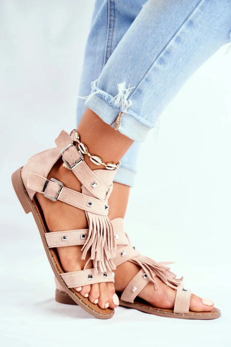 Tym razem coś dla Pań, które cenią sobie elegancki look nawet podczas upalnych letnich dni. Niesamowite sandałki w stylu boho, które podbijają serca kobiet. Wysoka cholewka, delikatne frędzle oraz srebrne dżety, sandałki które mają to coś! Suwak na zapiętku ułatwi zakładanie natomiast regulowane paski zadbają o lepsze dopasowanie do nogi. Przy wyborze rozmiaru prosimy sugerować się tabelą rozmiarów.