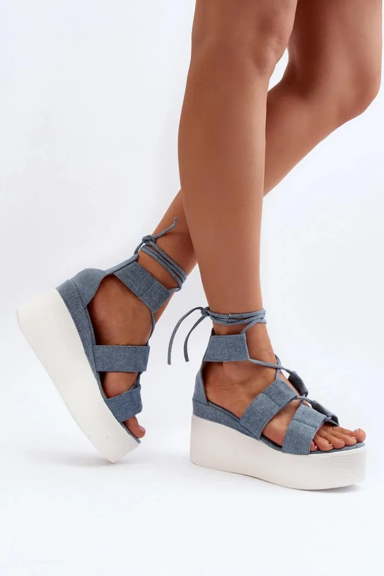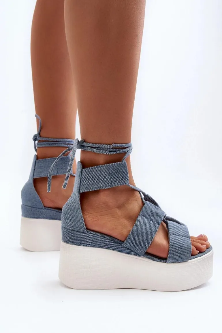 Sandały damskie osadzone na grubej platformie oraz koturnie. Wykonane z eko materiału tekstylnego. Model ten posiada modne wiązanie wokół kostki. Lekko profilowana wkładka z eko skóry zapewni wygodę podczas użytkowania. Fason ten dopasujesz do wielu stylizacji z letnimi sukienkami, spódnicami oraz spodniami! Przy wyborze rozmiaru prosimy sugerować się tabelą rozmiarów.