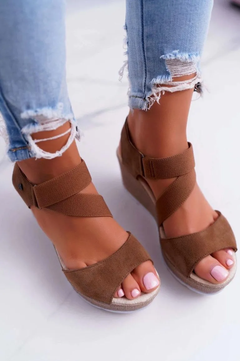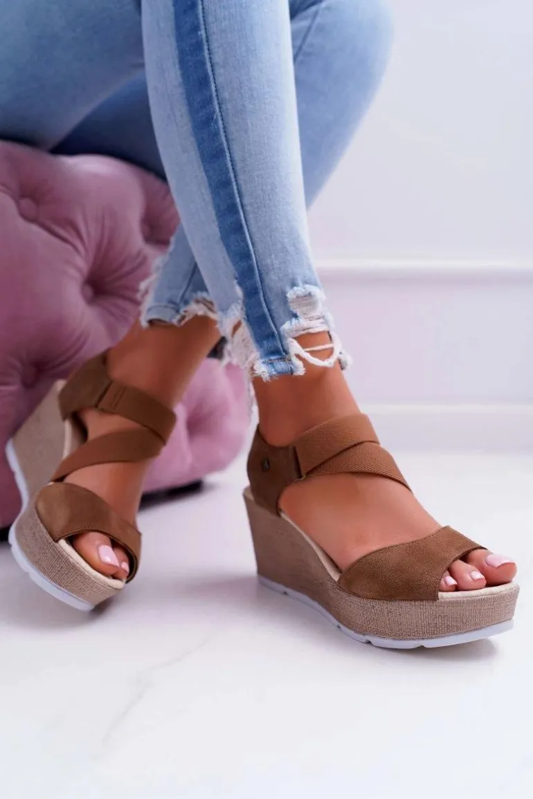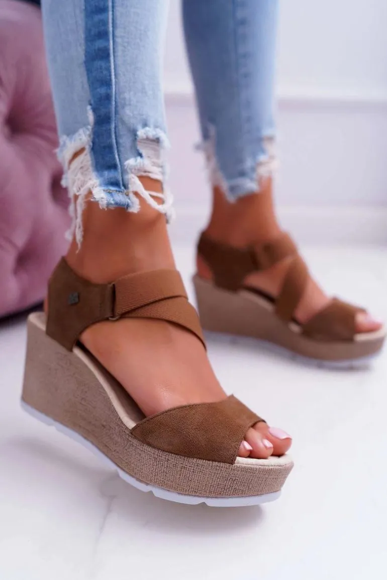 Sandały Damskie Na Koturnie Big Star Zamszowe Brązowe DD276035