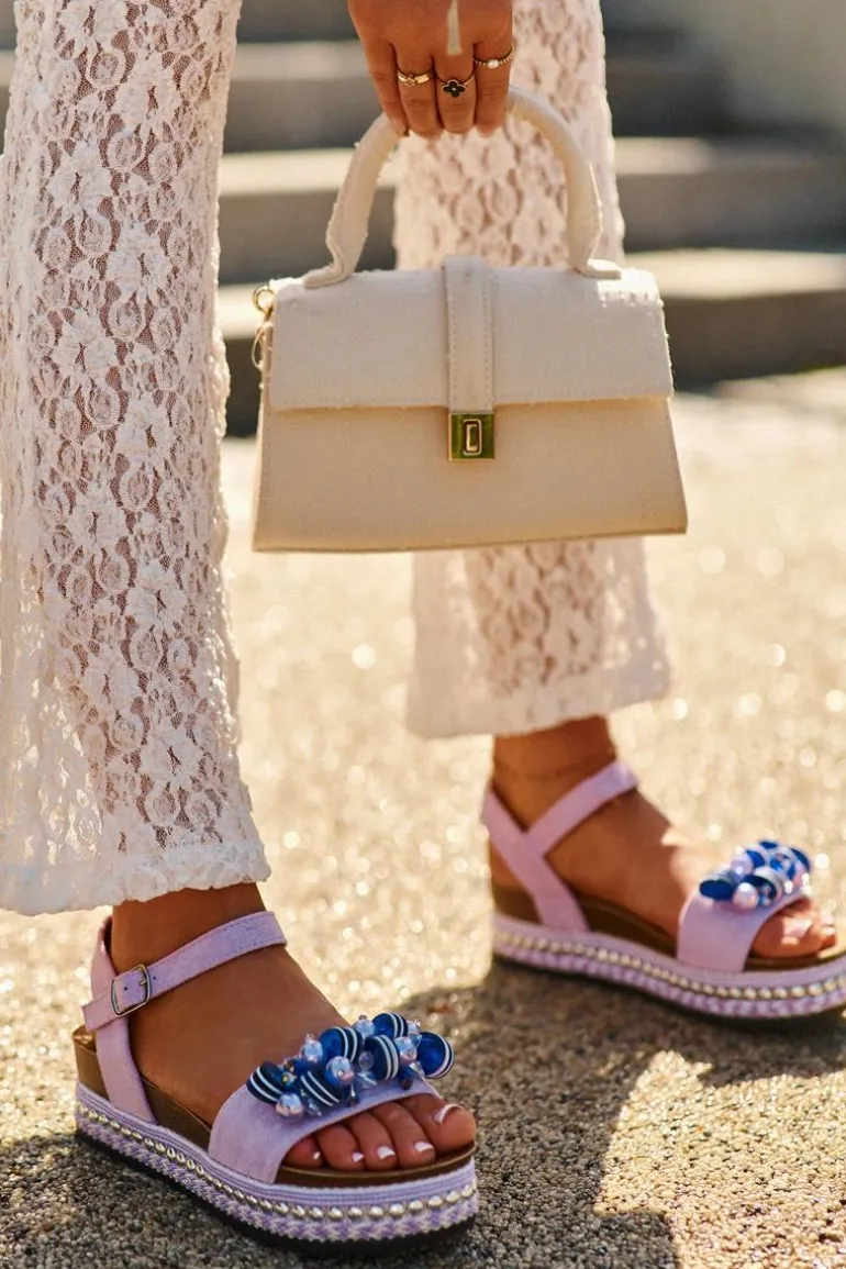 Sandały damskie wykonane z eko zamszu. Osadzone na zdobionej platformie i delikatnym koturnie. Regulowany pasek ze sprzączką gwarantuje idealne dopasowanie do stopy. Dodatkowo pasek z przodu ozdobiony detalami dodaje im niepowtarzalnego uroku i charakteru. Te sandały są doskonałym wyborem dla kobiet ceniących sobie modny wygląd i wygodę, idealne zarówno na codzienne spacery, jak i na letnie wyjścia. Przy wyborze rozmiaru prosimy kierować się tabelą rozmiarów.