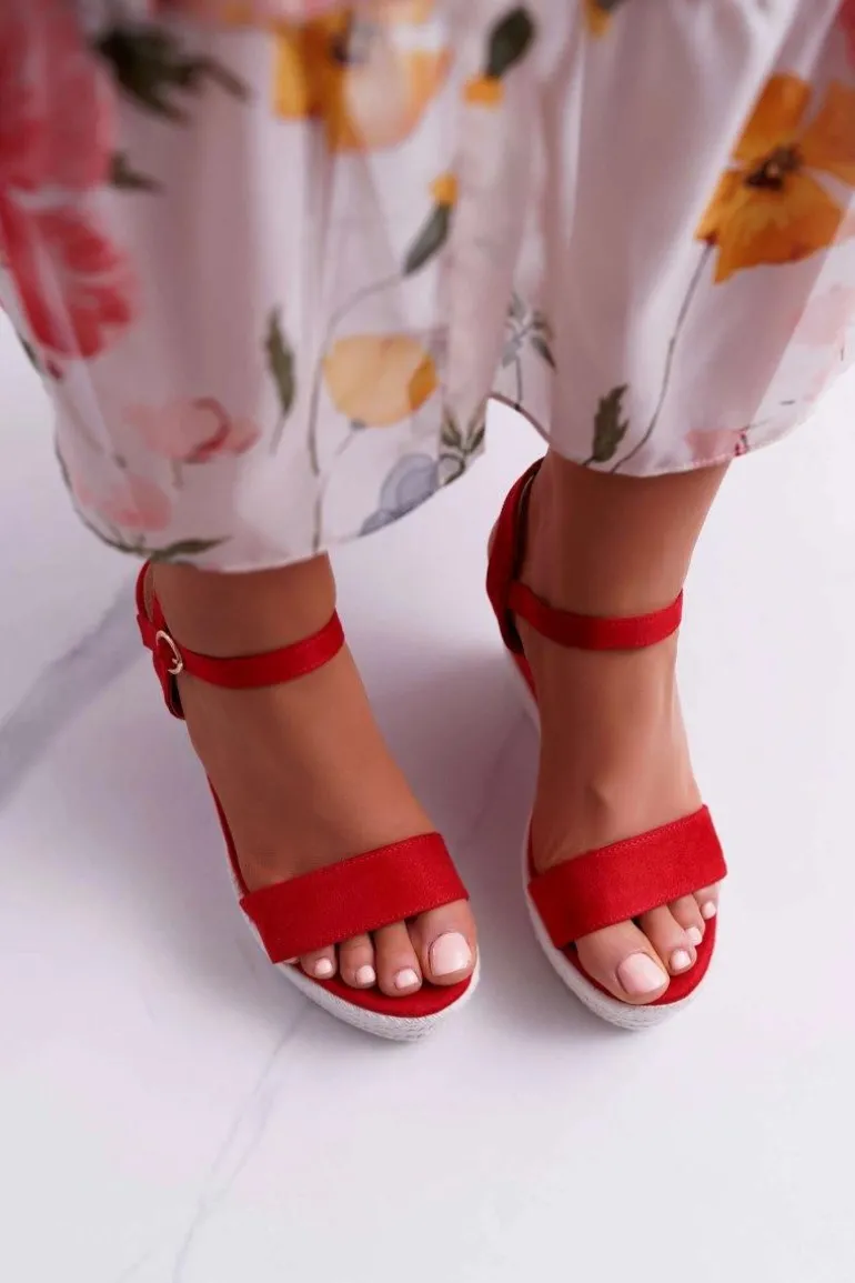 Sandały Damskie Na Koturnie Lniane Czerwone Liviana