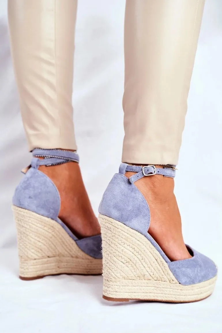 Sandały Damskie Na Koturnie Lniane Niebieskie Canterola