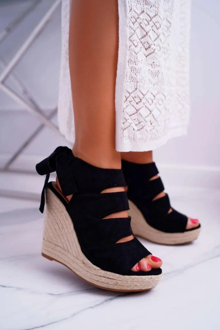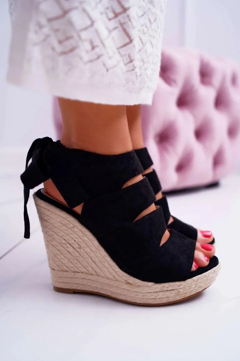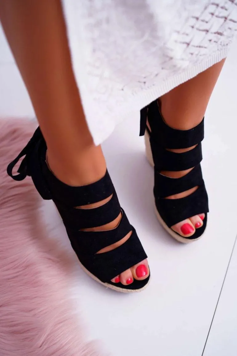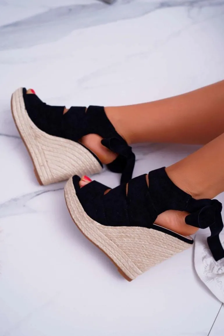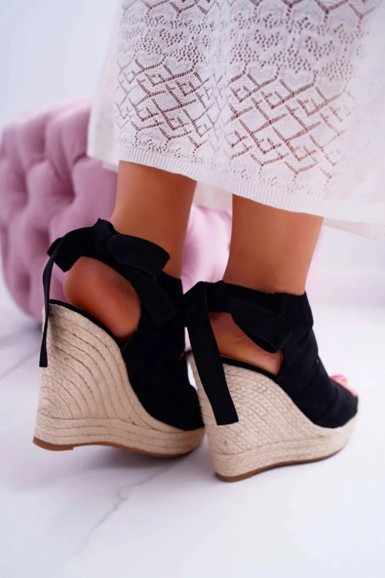 Sandały Damskie Na Koturnie Lniane Wiązane Czarne Cantare