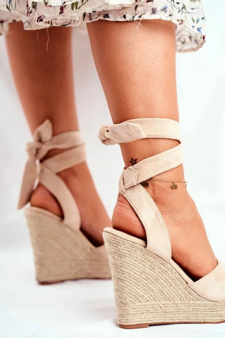 Sandały Damskie Na Koturnie Wiązane Beżowe Belleza