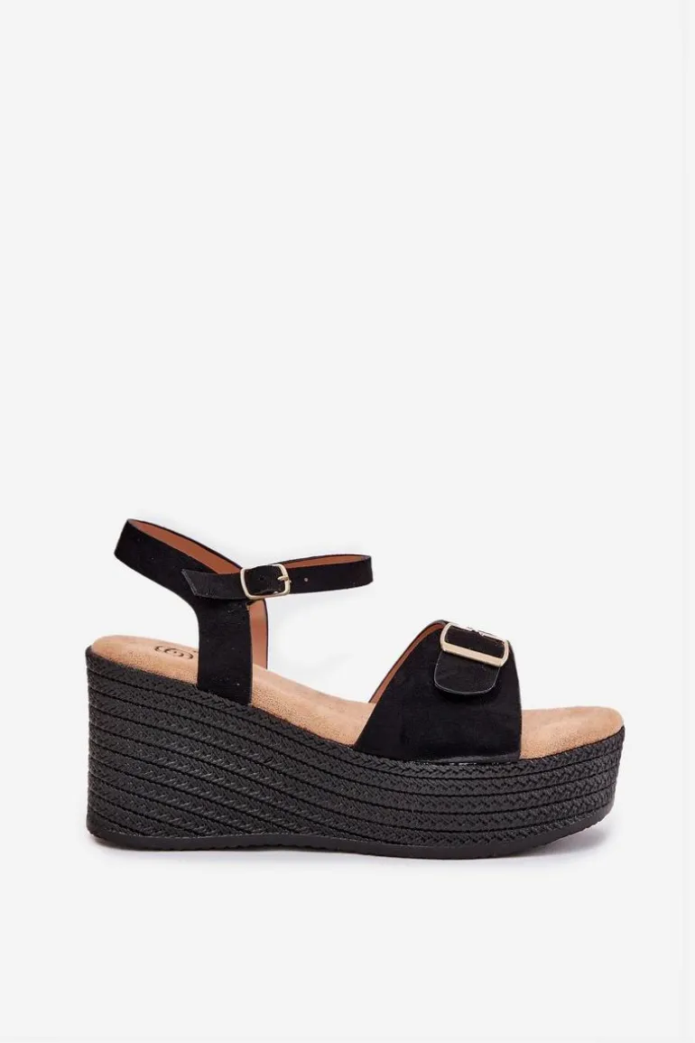 Damskie sandały wykonane z eko zamszu. Osadzone na koturnie i platformie z imitacją plecionki, zapewniają wygodę oraz stabilność przez cały dzień. Z przodu znajdują się ozdobna klamra, która dodaje im unikalnego charakteru. Model zapinany na sprzączkę umożliwia idealne dopasowanie do stopy, a miękka wkładka gwarantuje komfort. Te sandały będą doskonałym uzupełnieniem letnich stylizacji. Przy wyborze rozmiaru prosimy sugerować się tabelą rozmiarów.