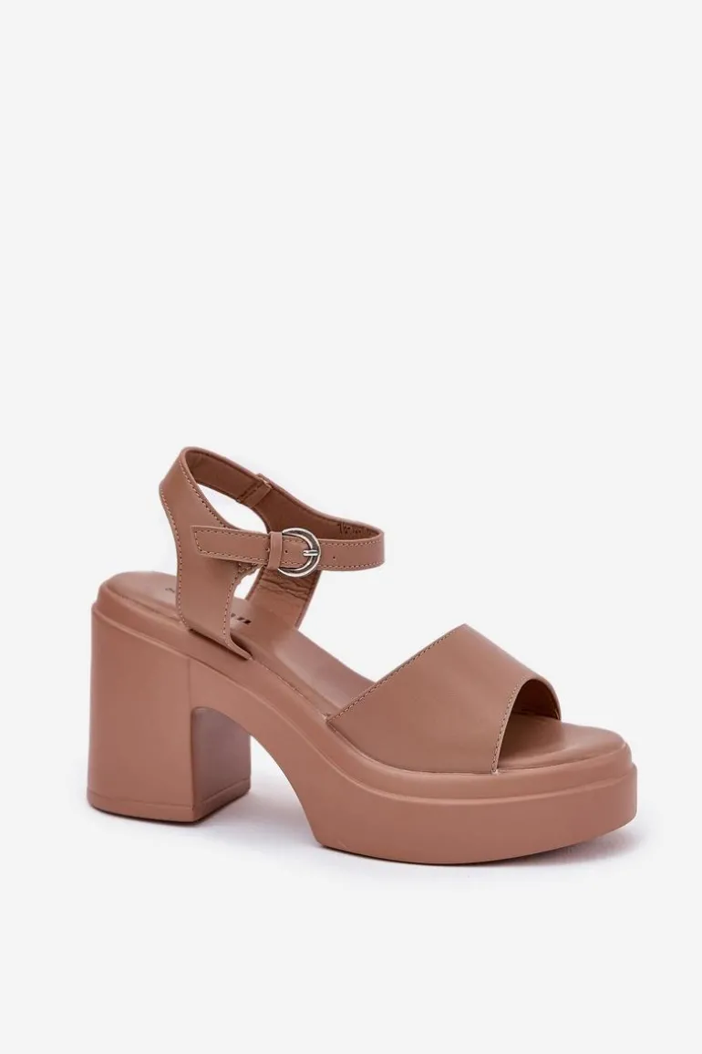Sandały damskie wykonane ze skóry ekologicznej. Platforma oraz masywny obcas w postaci słupka dodają pewności kroku, jednocześnie zapewniając stabilność. Zapinane wokół kostki na sprzączkę z regulowanym paskiem. Doskonałe na wiele różnych okazji! Przy wyborze rozmiaru prosimy sugerować się tabelą rozmiarów.