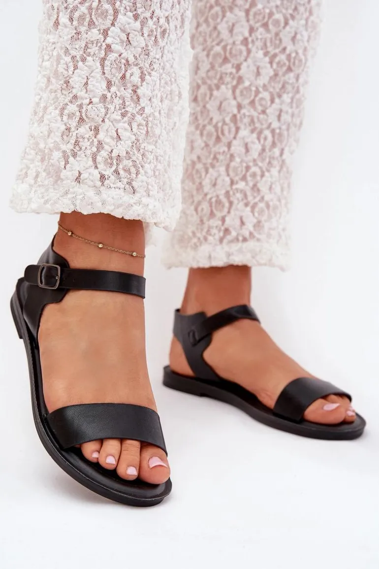 Sandały Damskie Na Płaskim Obcasie Eko Skórzane Czarne Kivara