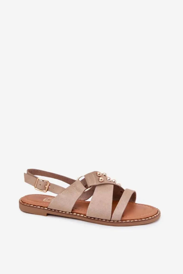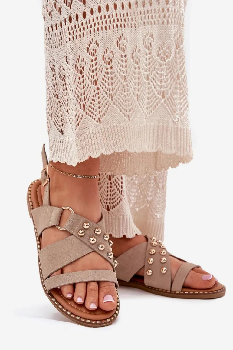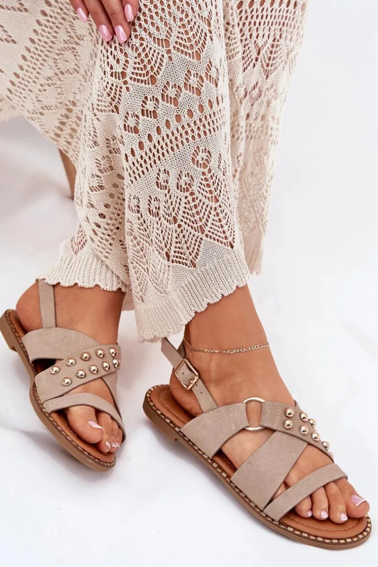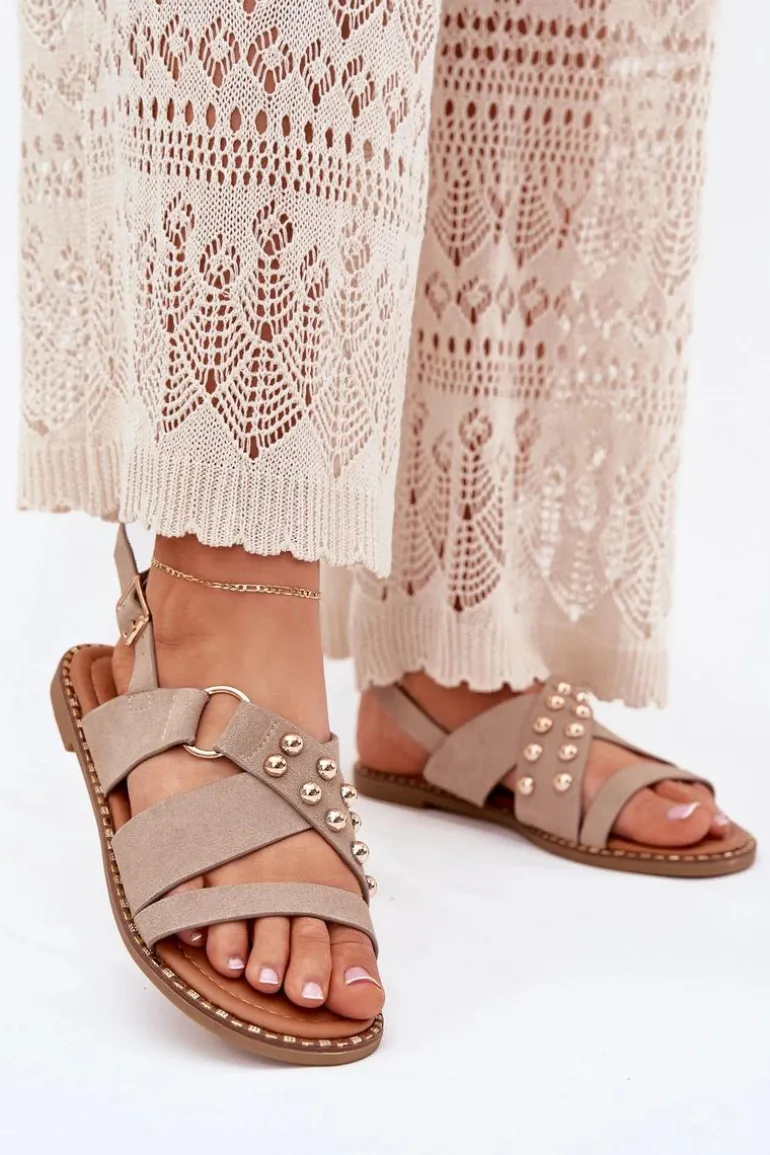 Sandały Damskie Na Płaskim Obcasie Ze Złotymi Ćwiekami Beżowe Zanira