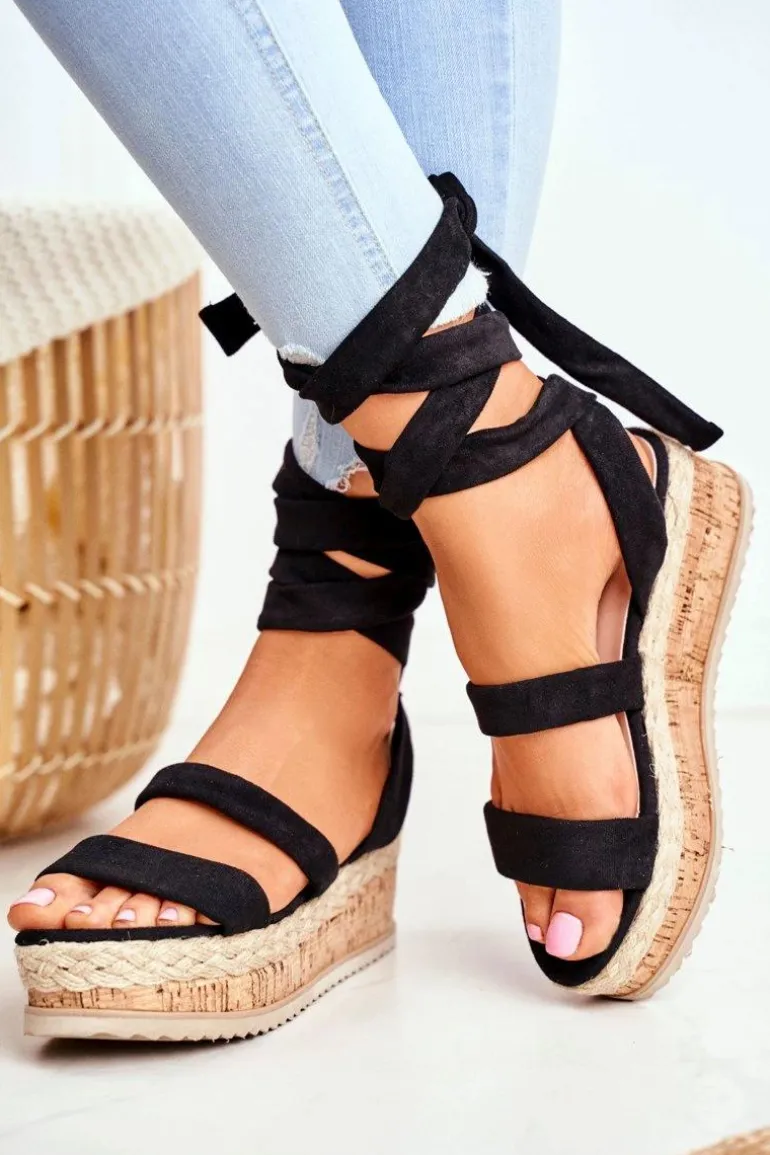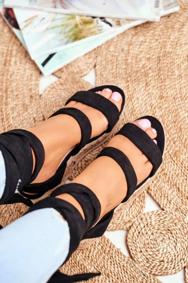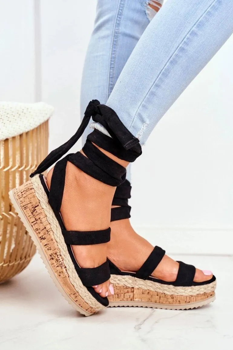 Sandały Damskie Na Platformie Wiązane Czarne La Favorite