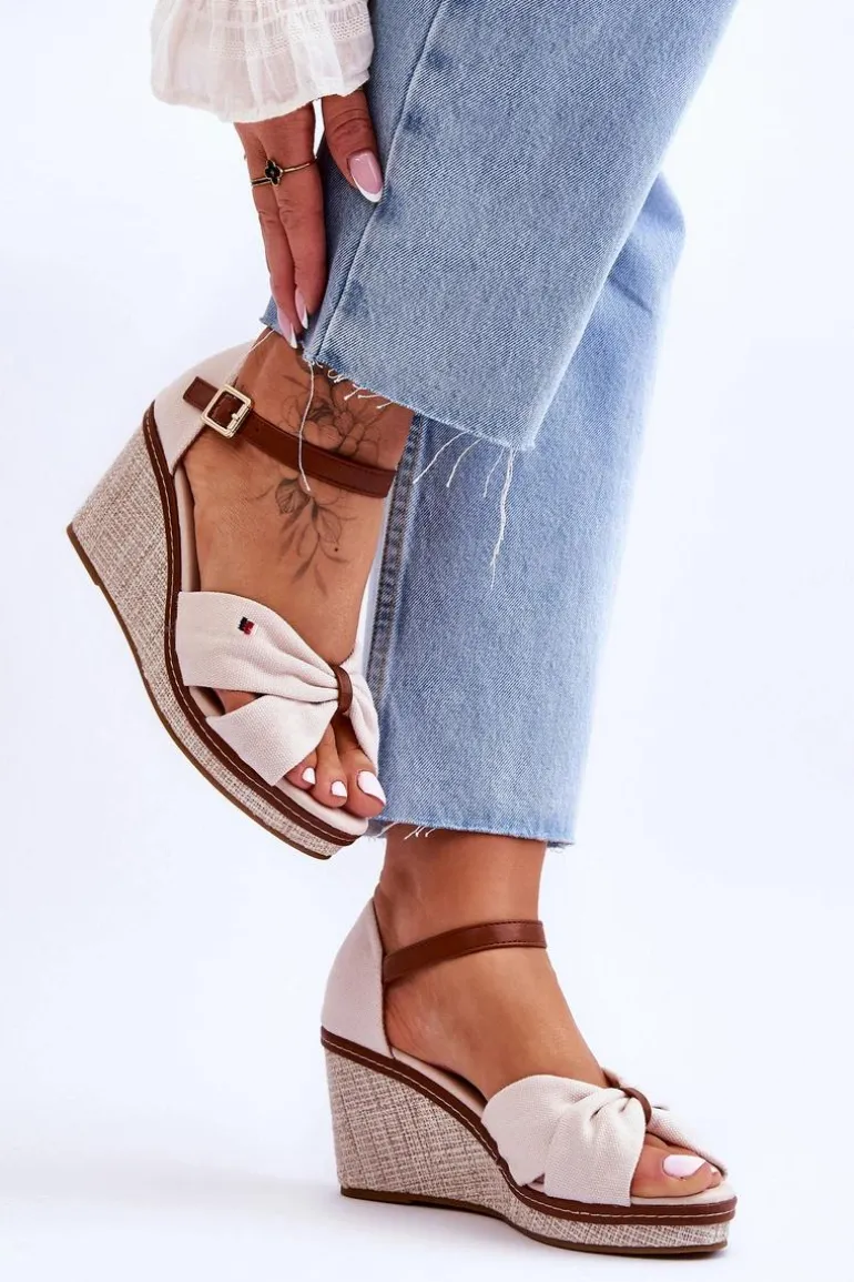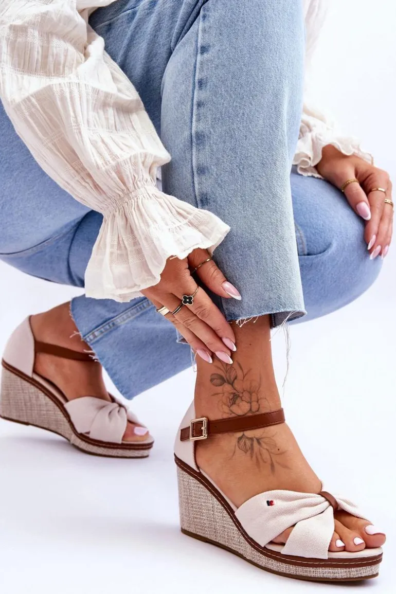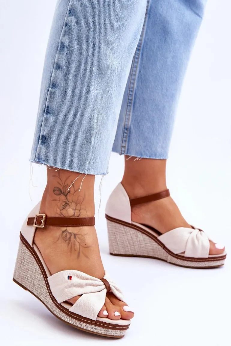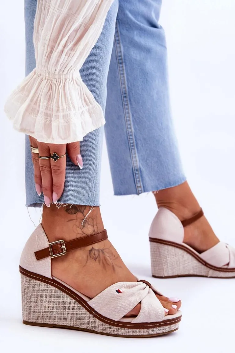 Sandały Damskie Na Plecionym Koturnie Beżowe Judith