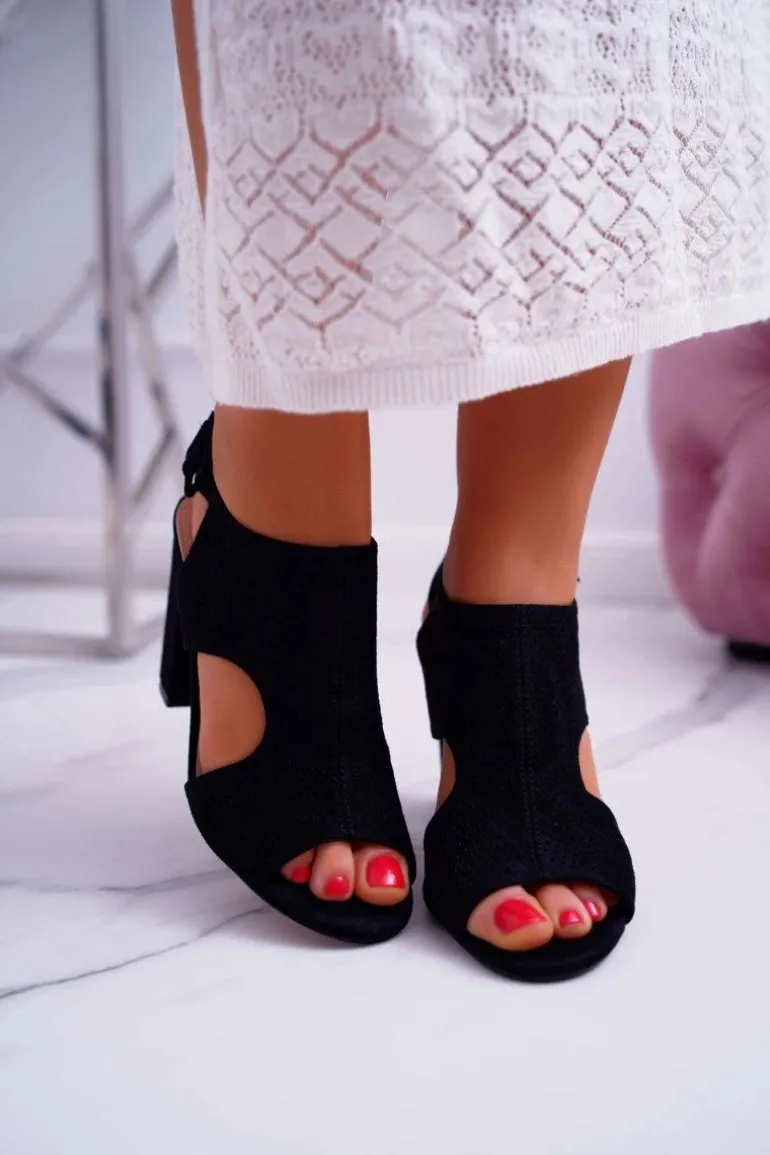 Sandały Damskie Na Słupku Ażurowe Zamszowe Czarne HiBaby