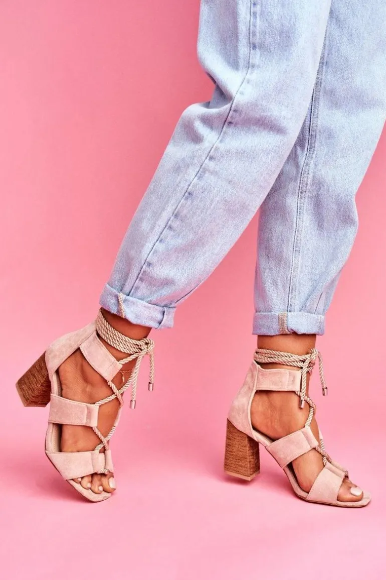 Sandały Damskie Na Słupku Wiązane Zamszowe Beżowe Amore