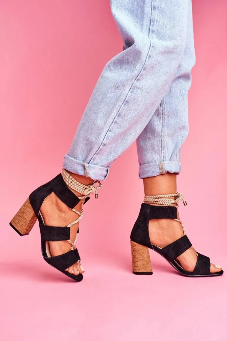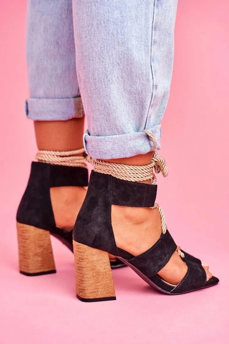 Sandały Damskie Na Słupku Wiązane Zamszowe Czarne Amore