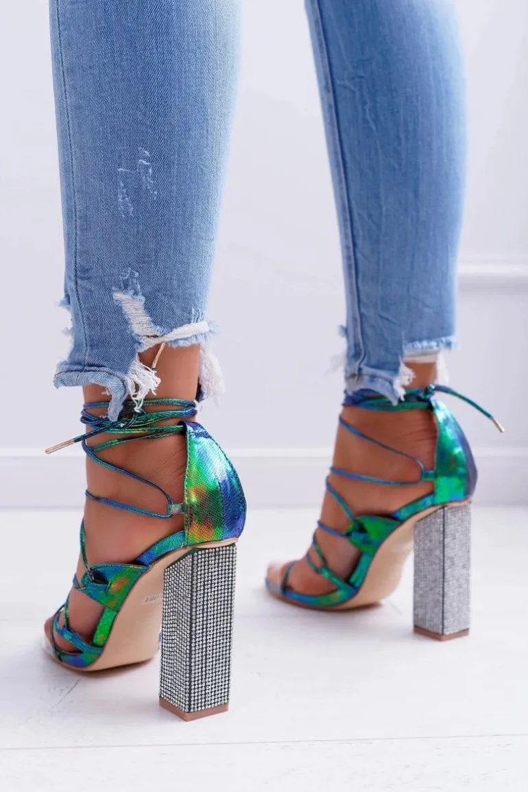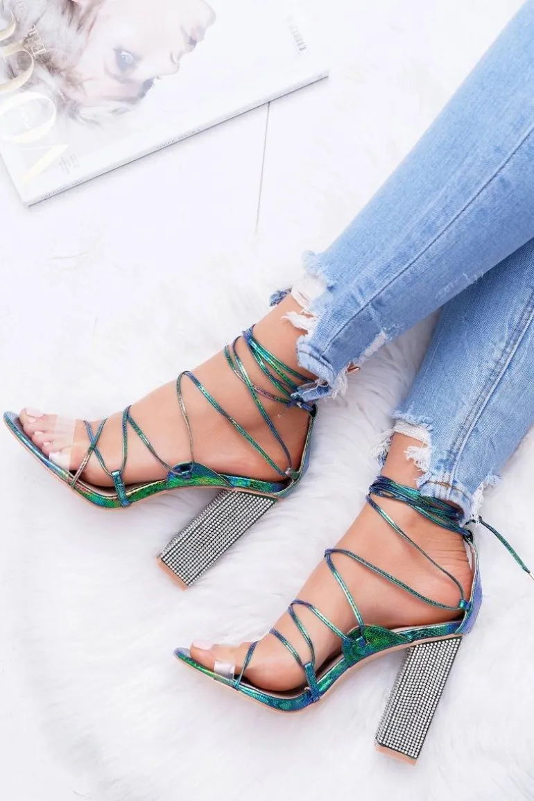 Sandały Damskie Na Słupku Z Cyrkoniami Benzynowe Wiązane Everything