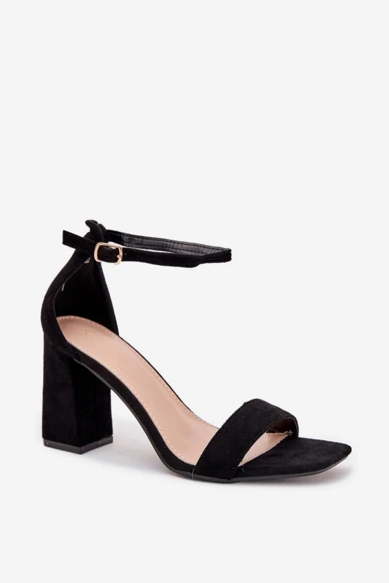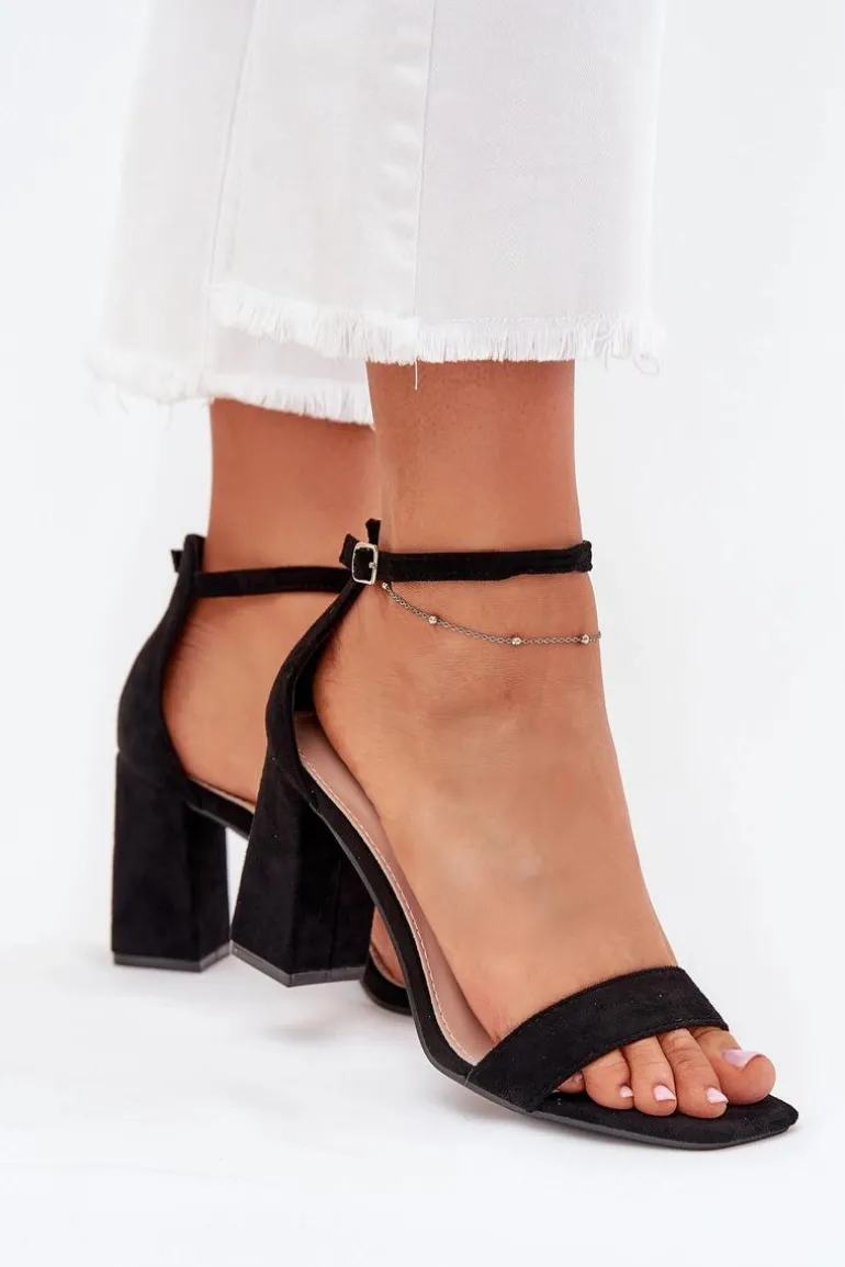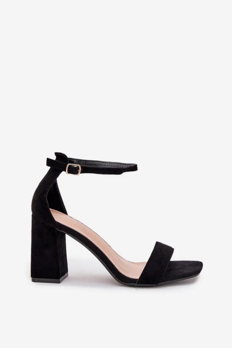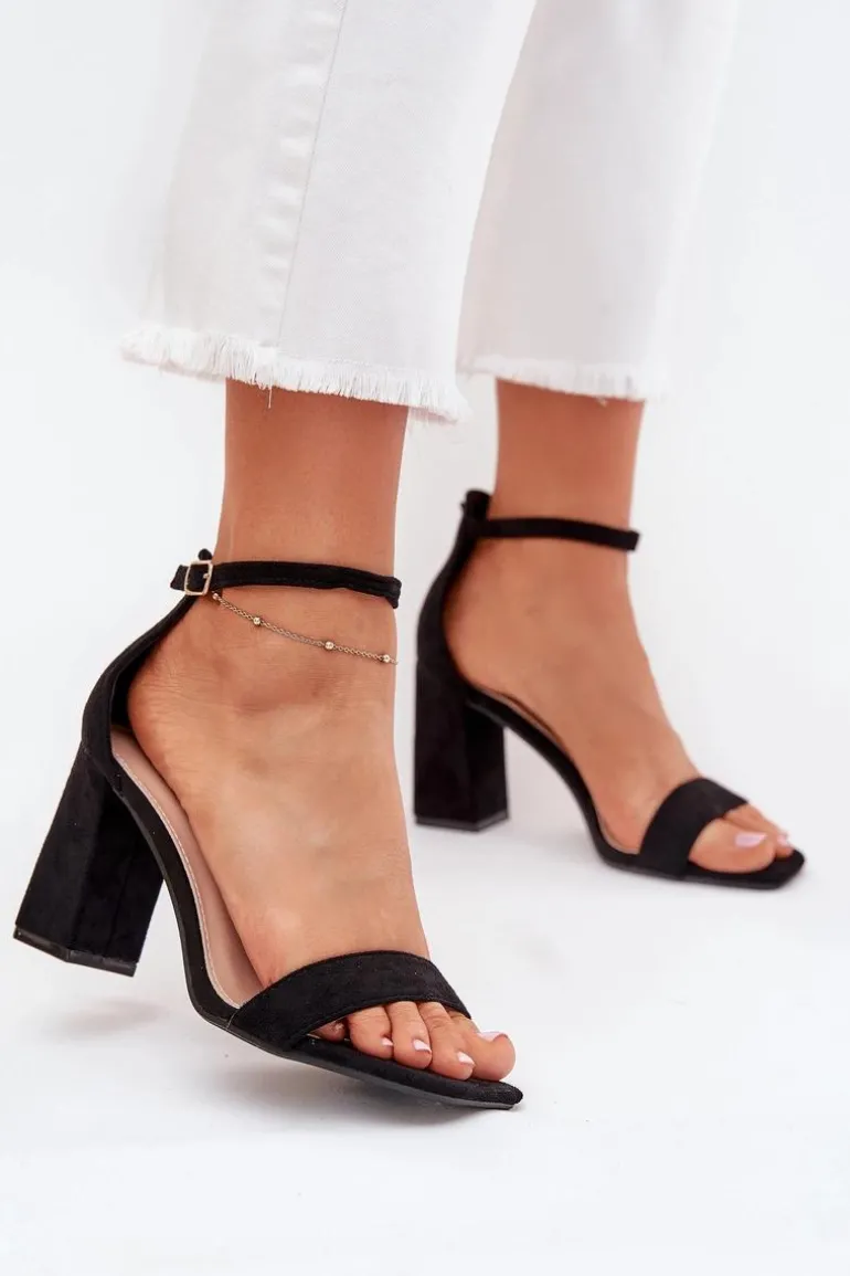 Sandały damskie z eko zamszu, osadzone na słupkowym obcasie, to klasyczna propozycja na różne okazje. Zapinane na sprzączkę z regulowanym paskiem, zapewniają idealne dopasowanie i komfort przez cały dzień. Doskonałe na wieczorne wyjścia, wesela czy inne uroczystości. Przy wyborze rozmiaru prosimy kierować tabelą rozmiarów.