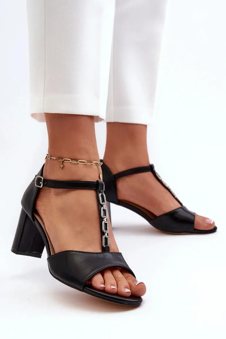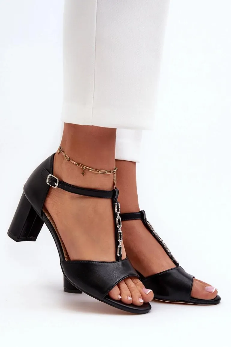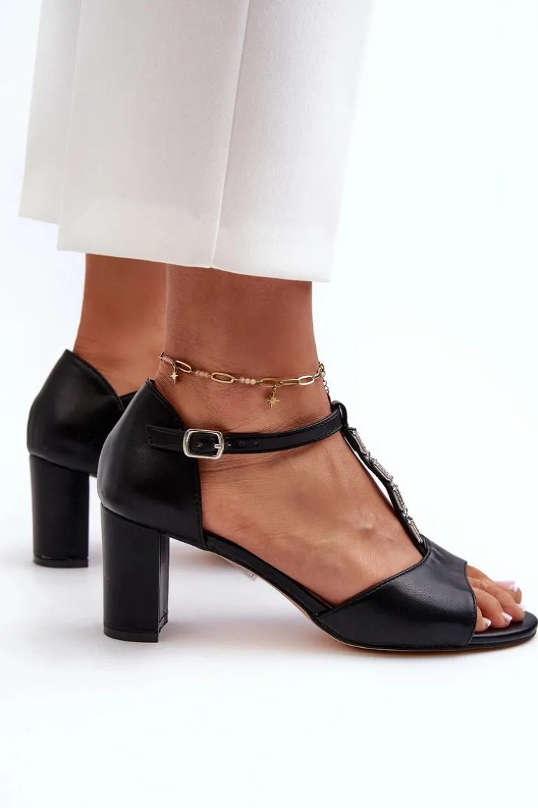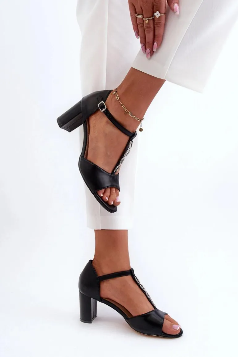 Sandały Damskie Na Słupku Z Ozdobnym Paskiem Eko Skóra Czarne Triavera