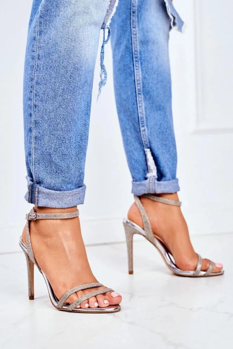 Sandały Damskie Na Szpilce Brokatowe Złote Demmis