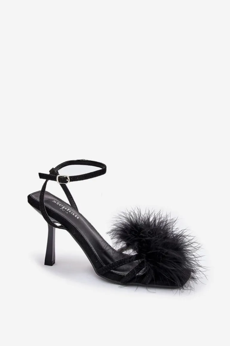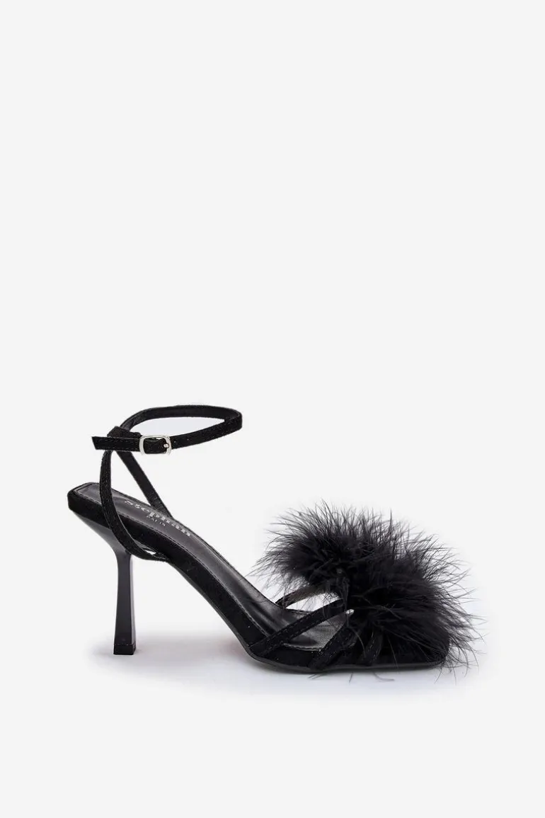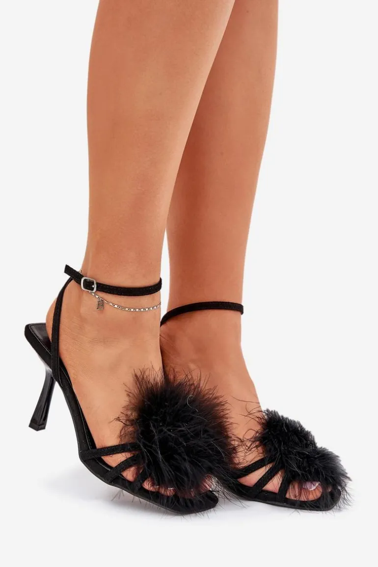 Eleganckie damskie sandały z eko zamszu, doskonałe na specjalne okazje. Osadzone na szykownej szpilce, wyróżniają się subtelną ozdobą z piór z przodu, co nadaje im lekkości i wyrafinowanego charakteru. Regulowany pasek ze sprzączką umożliwia idealne dopasowanie do stopy. To unikalny wybór, który doskonale dopełni wieczorowe i koktajlowe kreacje, przyciągając wzrok swoim niepowtarzalnym wyglądem. Przy wyborze rozmiaru prosimy sugerować się tabelą rozmiarów.