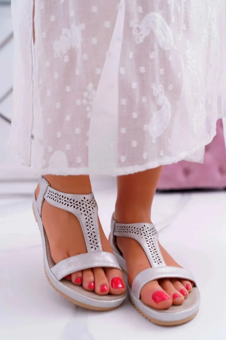 Sandały Damskie Płaskie Srebrne S.Barski Emente