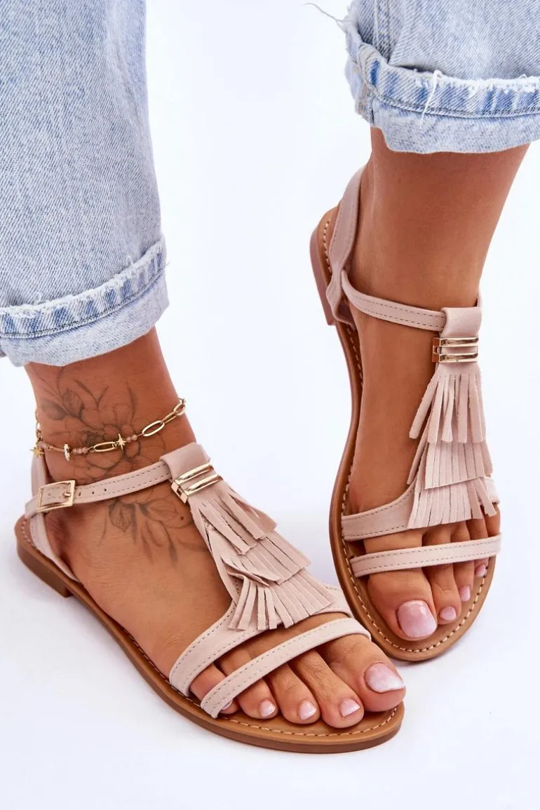 Sandały Damskie Płaskie Zamszowe Boho Beżowe Lucami